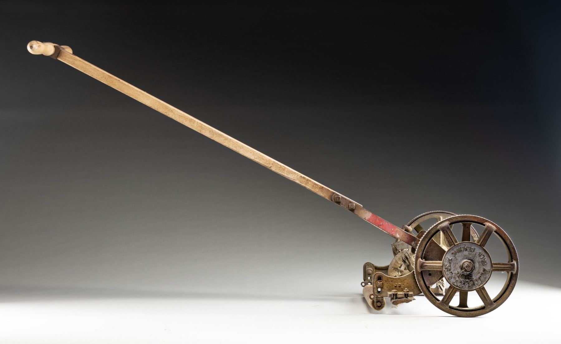 Vintage reel-type lawn mower mfg. by Winchester. Cast iron construction with wood handle, shaft, and roller. Metal plate atop handle is marked "M/ 438". Front of shaft is faintly marked with what appears to read "COMANCHE/ BALL BEARING" within a box, followed by "SELF-ADJUSTING/ PREMANENTLY RETAINED/BALL BEARINGS". Outer side of the treaded wheels are marked with the Winchester trademark logo above "STORE/ BALL BEARINGS". CONDITION: Iron parts retain areas of apparent original paint, exhibiting scattered patches and areas of oxidation overall. Wood parts exhibit general overall wear, scattered marks from handling and storage, as well as some cracking on the handle and roller. Right wheel catches, with mower currently being inoperable. PROVENANCE: Norman Olliff Estate. (02-25645/MLW). CURIO. $200-400.