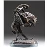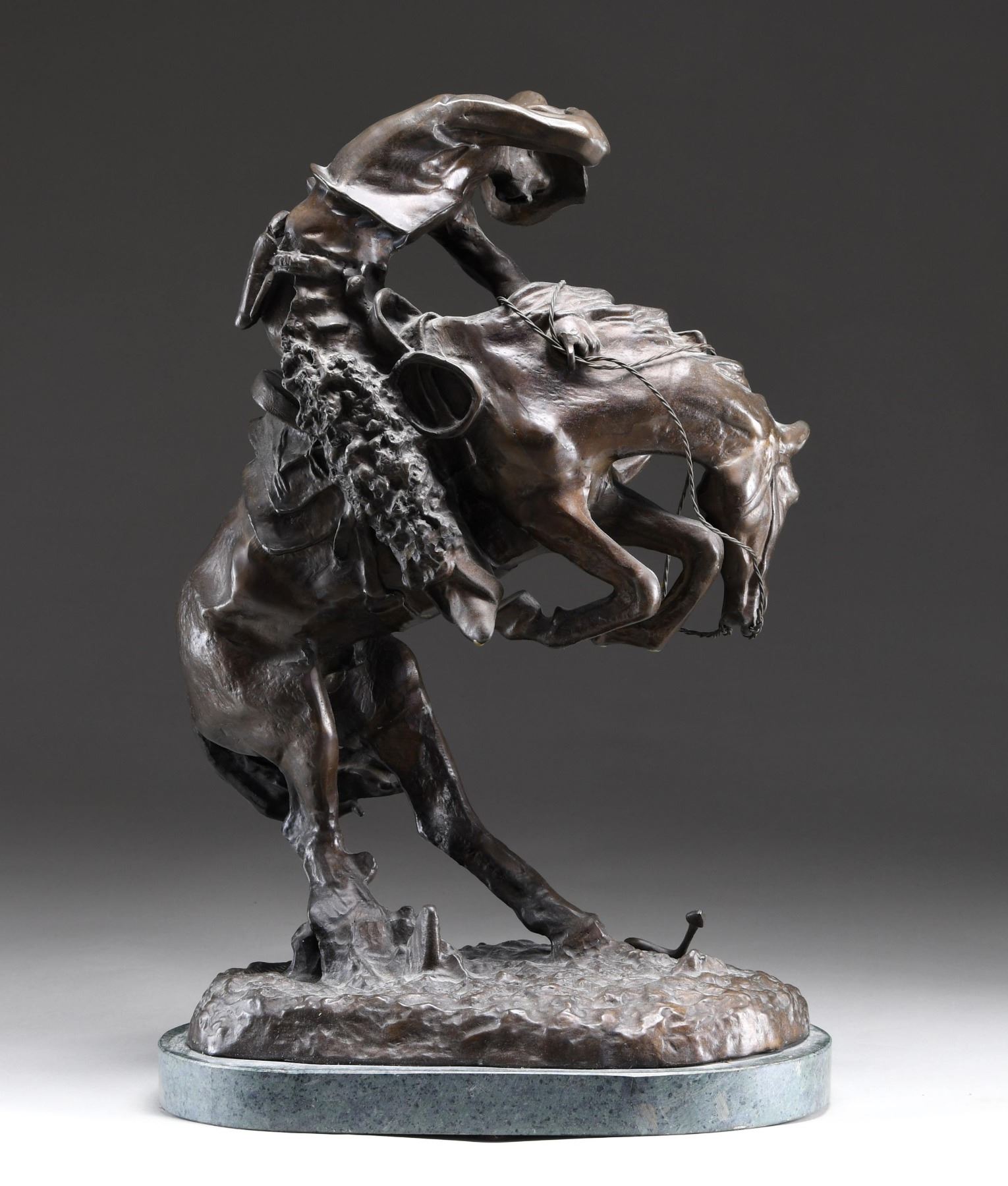 FREDERICK REMINGTON'S THE RATTLESNAKE FROM THE COLLECTION OF LT. COL. WILLIAM S. BROPHY. The bronze shows a cowboy clinging desperately to his horse, which is fearfully rearing away from a rattlesnake. The bronze is marked "Frederick Remington Copyright". The statue is mounted on a granite oval base, which measures approx. 8 1/2" by 14". The entire statue is approx. 22 1/2" tall & measures approx. 15" in width. CONDITION: statue appears in very good condition. Details including the rattlesnake are complete. PROVENANCE: letter dated February 17, 2025, "To whom it may concern, The lot consists of a reproduction of the notable Frederick Remington bronze entitled 'The Rattlesnake'. Once owned by the late Lt. Col. William S. Brophy (Ret). Thank you. Best regards, Gail Brophy Barry". (02-24006/RW). NON-GUN. $400-600.