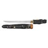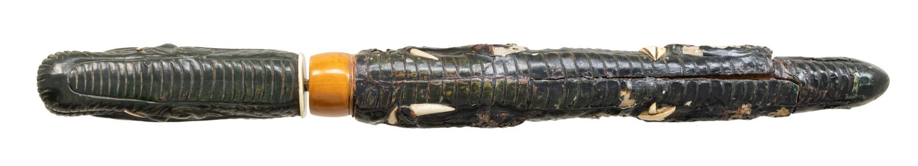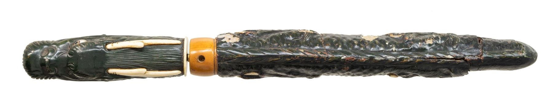 EFFIGY TSUKA AND SAYA. This artistically rendered tanto is likely from Japan or one of its neighboring islands. It measures 16" overall with a 10 1/2" blade and a gilded brass habaki. There is a small tsuba made of an organic white material and the carved wooden dragon head tsuka has organic white horns and fangs. The dragons eyes are painted glass and present a piercing stare. The saya is the wooden and lacquered paper mache body of the dragon with white organic highlights. There is a carved wooden koiguchi with a white organic insert. CONDITION: The blade retains a good polish and the tsuka shows light wear. The saya has drying cracks in a few places and some of the paper mache has flaked away. (02-25817/BF). $400-600.