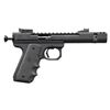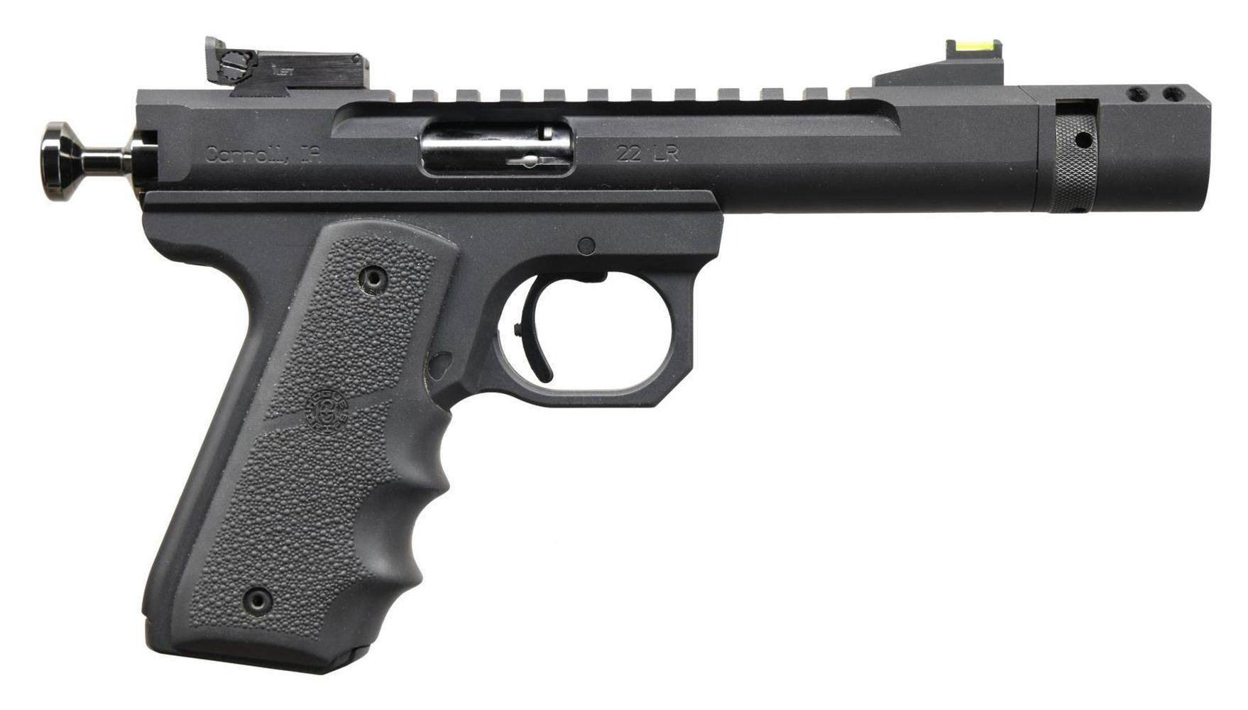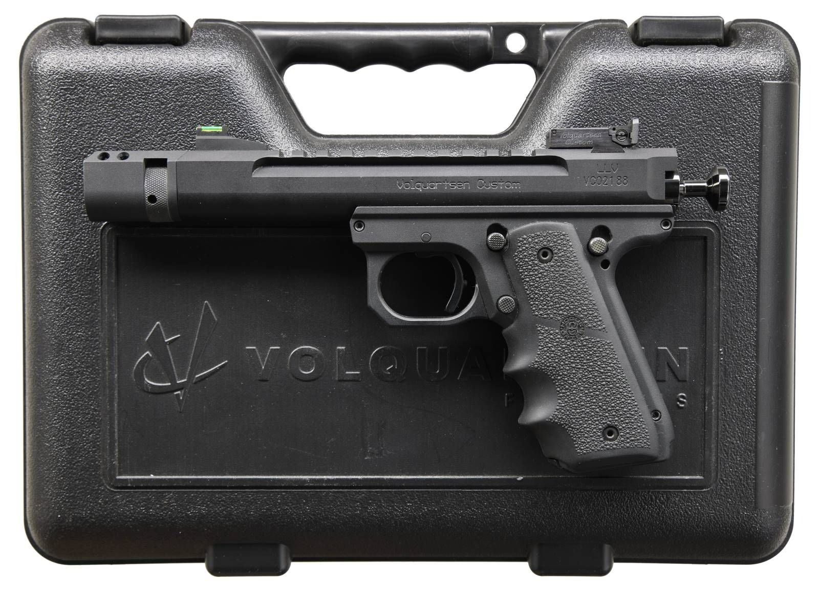 Cal. 22 LR. S# VC02188. Bbl. 4 1/2" plus factory muzzle brake; 5 1/2" overall. Left of receiver marked "Volquartsen Custom" yet has appearance of Scorpion model. Integral Picatinny rail, green fiber optic front sight and factory adjustable rear. Design based on Ruger 22/45 with custom features to include: checkered extended controls, no magazine safety, black hard chromed bolt with easy cocking extension, match grade lock work to include trigger having overtravel and engagement adjustment. Bottom of barrel drilled and tapped for weights plus Hogue wrap around finger groove rubber grips. Introduced in 2012 and currently in production. MAGS: 4 Ruger 10 rd. with owner applied white numbers (1 to 4) on bodies. UNATTACHED ACCESSORIES: factory black plastic case, tool and manual. CONDITION: all aspects near excellent including bore with like new appearance. (23-5752/NW). MODERN. $900-1,400.