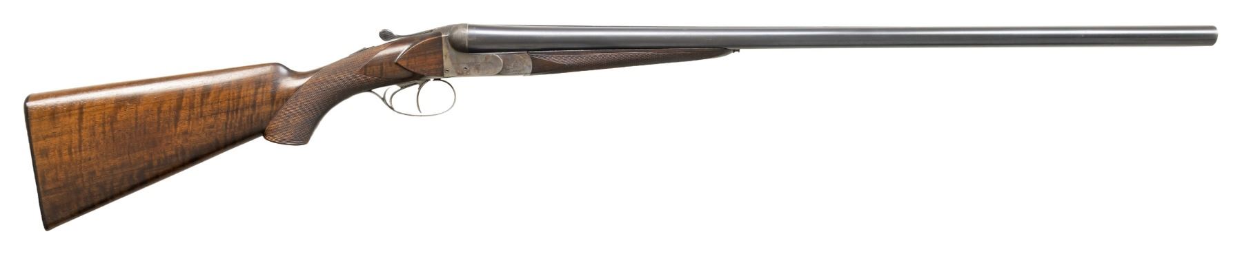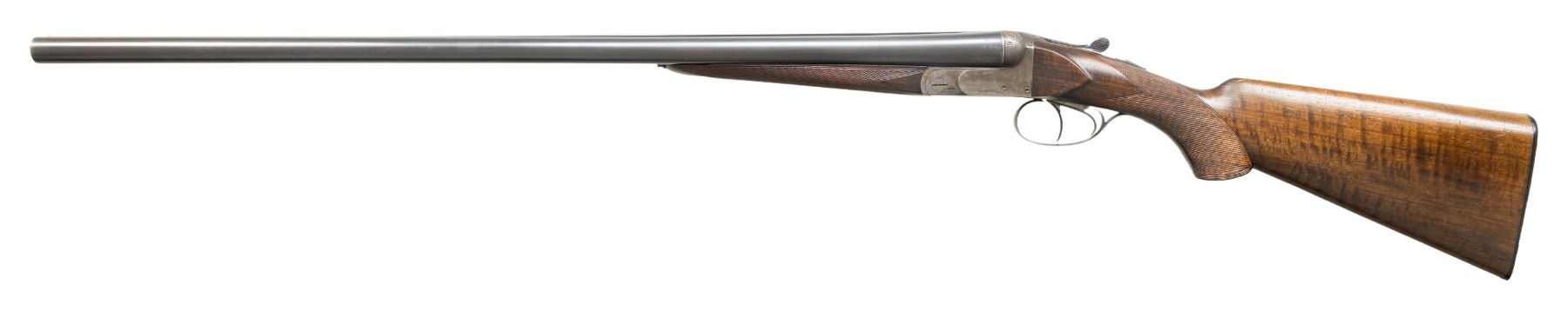 BELGIAN SXS SHOTGUN. Cal. 12 ga. 2 1/2". S# 82535. Bbls. 28" with steel front bead. Water table of barrels have standard Belgian ELG proofs. Case colored boxlock action with double underlug and cross bolt locking. Double triggers and ejectors. Action has simple floral engraving around the screws with stippled top surfaces. Splinter forearm and pistol grip stock of nicely grained walnut with hand checkering. LOP: 14 1/8" over a horn buttplate. DAC: 1 1/2". DAH: 2 9/16". Stock has a slight cast-on. Bore diameter: R .727. L .727. Choke constriction: R .012. L .037. Minimum wall thickness: R .033. L .033. WEIGHT: 6 lbs, 7.4 oz. Von Lengerke & Detmold was absorbed by Abercrombie & Fitch during the early 1930s. CONDITION: barrels retain over 80% lightly faded blue. Action shows over 30% lightly visible case colors. Stocks have lightly worn finish and checkering showing scratches and marks. Action is tight and on face. Very good bright bores. PROVENANCE: Estate of Lloyd Robinson. (25-6669/DS). CURIO. $800-1,200.