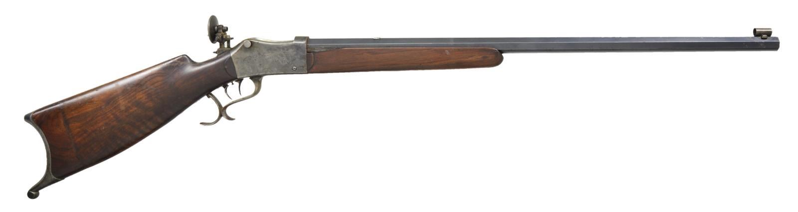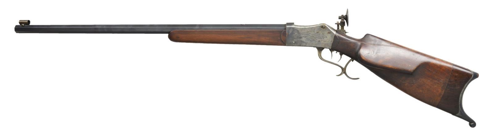 Cal. 32-40. S# NSN. Bbl. 29" Winchester 1885 VP proofed #3 having proper Winchester markings and dovetails (top and bottom). Front sight is dovetailed globe sight similar to Sharps #110 with small post and bead. Rear of barrel has blank in dovetail. Rear target tang sight is of European style having large target disk and clock key square adjustments plus "35" on left side of base. Mfg. in Germany using case colored Martini action having double set triggers and "BERLIN" engraved within decorative banner on right side. Left side has similar engraving with "W. FOERSTER" who was the gun maker of kings yet his known works are of higher workmanship than this example, save the action. Wilhelm Foerster's name and company continued beyond his death. Uncheckered walnut stock set. Forend has key hole style rosewood insert at tip, side panels at receiver plus oval metal reinforcement for attachment to barrel (missing screw). Buttstock has side panels at receiver, carved cheekpiece plus cast steel Schutzen style buttplate at 13 3/8" LOP; between buttplate and basic stock is a walnut spacer of about 1 1/2". CONDITION: good overall appearance with some spots of light oxidation and some peppery oxidation. Good case colors with slight fading. Action lever has patina tone. Barrel is best appearing with some slight oxidation at receiver juncture; appears original finish. Forend has no finish remaining plus sliver missing at top right rear. Buttstock is fair with repairs, minimal finish and some streaks from action rearward appearing from chemical cleaners used on receiver. Very good to excellent bright bore with hint of wear but no pitting or frosting. Proper mechanical functioning including set triggers. PROVENANCE: Estate of Frank Glenn Marsh. (22-3383/NW). MODERN.