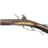 FLINTLOCK KENTUCKY RIFLE. Cal. 50. NSN. Bbl. 42 1/2" of double taper octagon. Top flat is engraved "W. GUSLER Williamsburg. Va". Wallace Gusler was the master gunsmith at Colonial Williamsburg producing fine handmade rifles under he retired in 2004. German silver blade front sight w/ fixed rear sight, sight base is engraved 1969. Plain unmarked lock. Curled plain trigger. Full length pin fastened cheekpiece maple stock. Right side has a rectangular lid pierced & engraved daisy finial brass patchbox. Brass finger curled trigger guard. Wide brass buttplate & toe plate w/ floral engraving. Engraved brass side plate. Cheekpiece has a molded edge that is bordered by vine type relief floral carving. Vine type relief carving is also found around top tang & thimble. Lower edge of stock & ramrod channel have molded borders w/ highlights of incise carving. Hardwood ramrod is held by a brass thimble & 2 faceted brass pipes. WEIGHT: 8 lbs, 15.6 oz. CONDITION: bbl. & lock retain over 90% brown finish showing slight edge wear w/ scattered spotting. Brass fittings have acquired a mild patina. Stock has very good finish showing small marks. Bore retains sharp rifling. (01-21955/DS). ANTIQUE. $4500-6500.