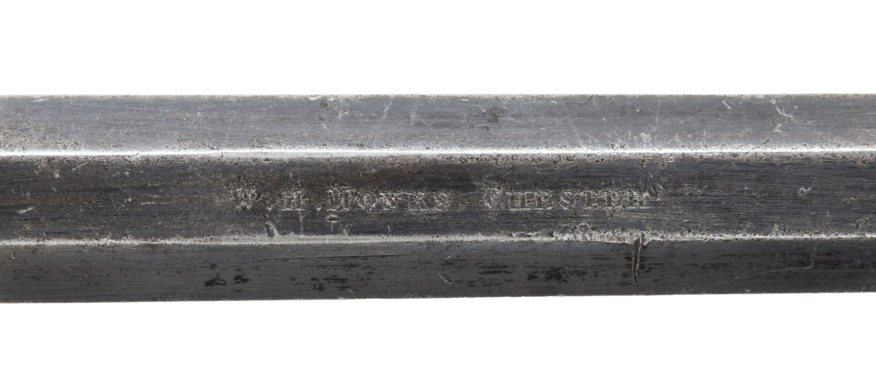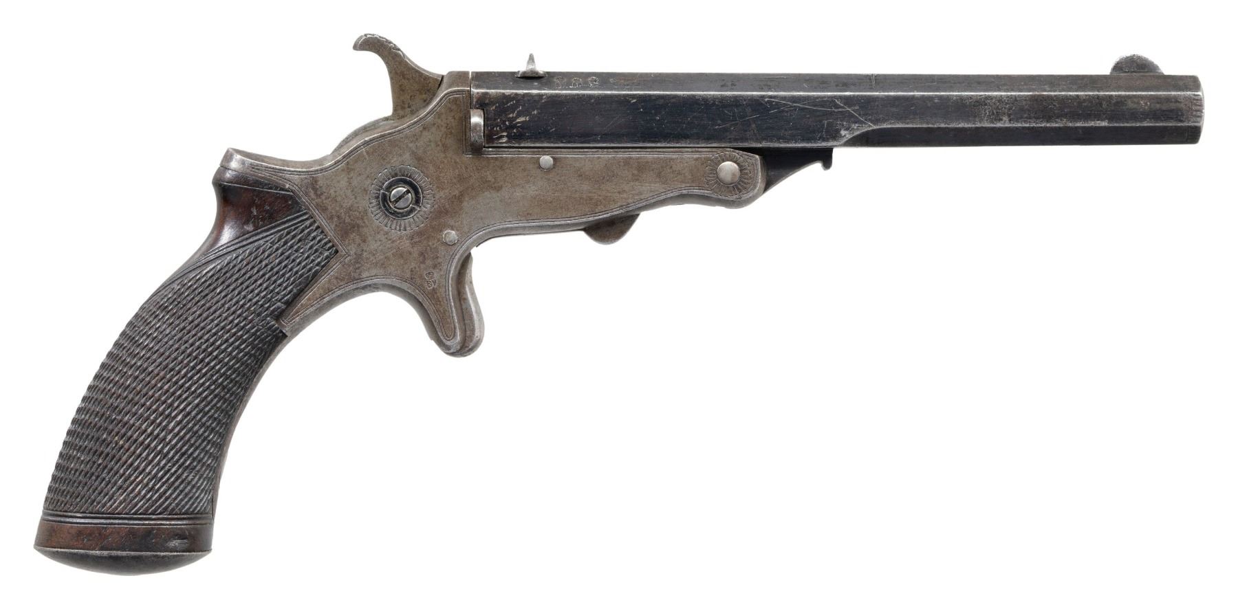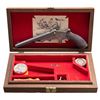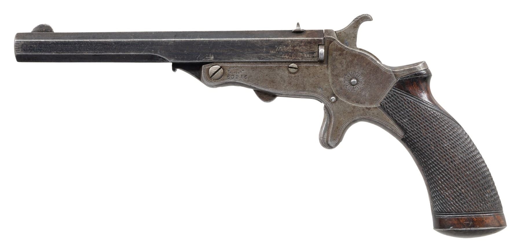 .22 RF PISTOL WITH CASE & ACCESSORIES. Cal. 22 RF. S# 60216. Bbl. 6". Tranter patent single shot break action pistol mfg. by W.H. Monks of Chester, England. The top of the bbl. is engraved "W.H. MONKS CHESTER", with 3 British proofs marked on the right quarter flat towards the breech. Left side of frame is marked "W. TRANTERS/ PATENT" above the S# "60216". Sides of frame exhibit double line border engraving, with a single floral motif on the left, and 2 floral motifs on the right. Right side of frame and underside of bbl. are marked with a crowned Birmingham special definitive proof. Bbl. exhibits a blue finish. 1-piece wood grip featuring a single panel of wrap around checkering and a plain oval steel pommel cap. Fixed blade front sight with dovetailed V-notch rear sight. Bbl. has been sleeved to .22 RF. UNATTACHED ACCESSORIES: contemporary wood display case featuring a red velour interior, containing 1 contemporary plastic container of .22 caliber CB type ammunition, 1 tin of patches, a contemporary cleaning rod with threaded wood handle, as well as a case key. CONDITION: frame has faded to a dull mottled gray patina, showing scattered superficial handling marks, age related discoloration, and some light pitting overall. Bbl. retains large amounts of its original blue finish, showing mild wear (primarily on edges), scattered handling marks, as well as scattered spots of light surface oxidation. Mirror bore, exhibiting some spots of light pitting, while retaining strong rifling throughout. Proper manual mechanics. Grip shows mild smoothing and some scattered superficial marks and minor impressions, but otherwise remains sound. Case is very good, some with superficial handling marks to exterior. (01-28009/MLW). ANTIQUE. $400-700.