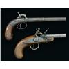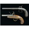 1) W. KETLAND & CO. FLINTLOCK. Cal. 40. NSN. Bbl. 4 1/16" rnd. w/ smooth bore. Monoblock section of bbl. marked on top "LONDON" w/ proof marks on left side. Front 3" of bbl. appears to be replacement. W. Ketland & Co. lock w/ simple border line engraving. Walnut rnd. butt stock w/ brass trigger guard. CONDITION: metal finish has faded to gray. Forward section of bbl. has deep wrench marks. Stock has added wood repair above forward portion of lock w/ numerous chips surrounding lock. Wood has worn finish showing dents, scratches & marks. Lock has weak spring tension. Pitted bore. (01-19122/DS). 2) ALLEN & THURBER PERCUSSION. Cal. 36. S# 567. Bbl. 6 1/2" rnd. w/ oct. shank. Iron boxlock action has center mounted hammer. 2 Piece walnut bag type grips. CONDITION: metal finish has faded to gray showing scattered light pitting. Grips have age darkened appearance showing dents & handling marks w/ chips along lower tang at action & butt. Hammer will not hold in cocked position. Pitted bore w/ partially intact rifling. (01-19126/DS). BOTH ANTIQUE. $300-500.