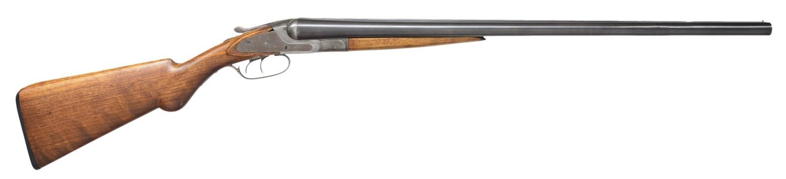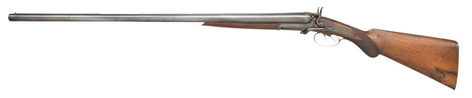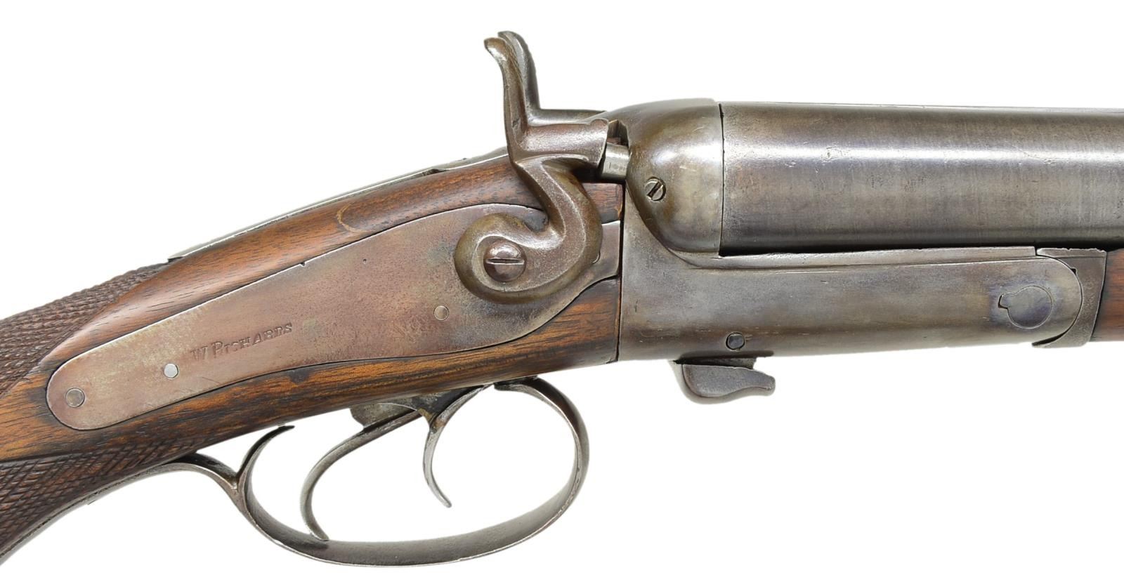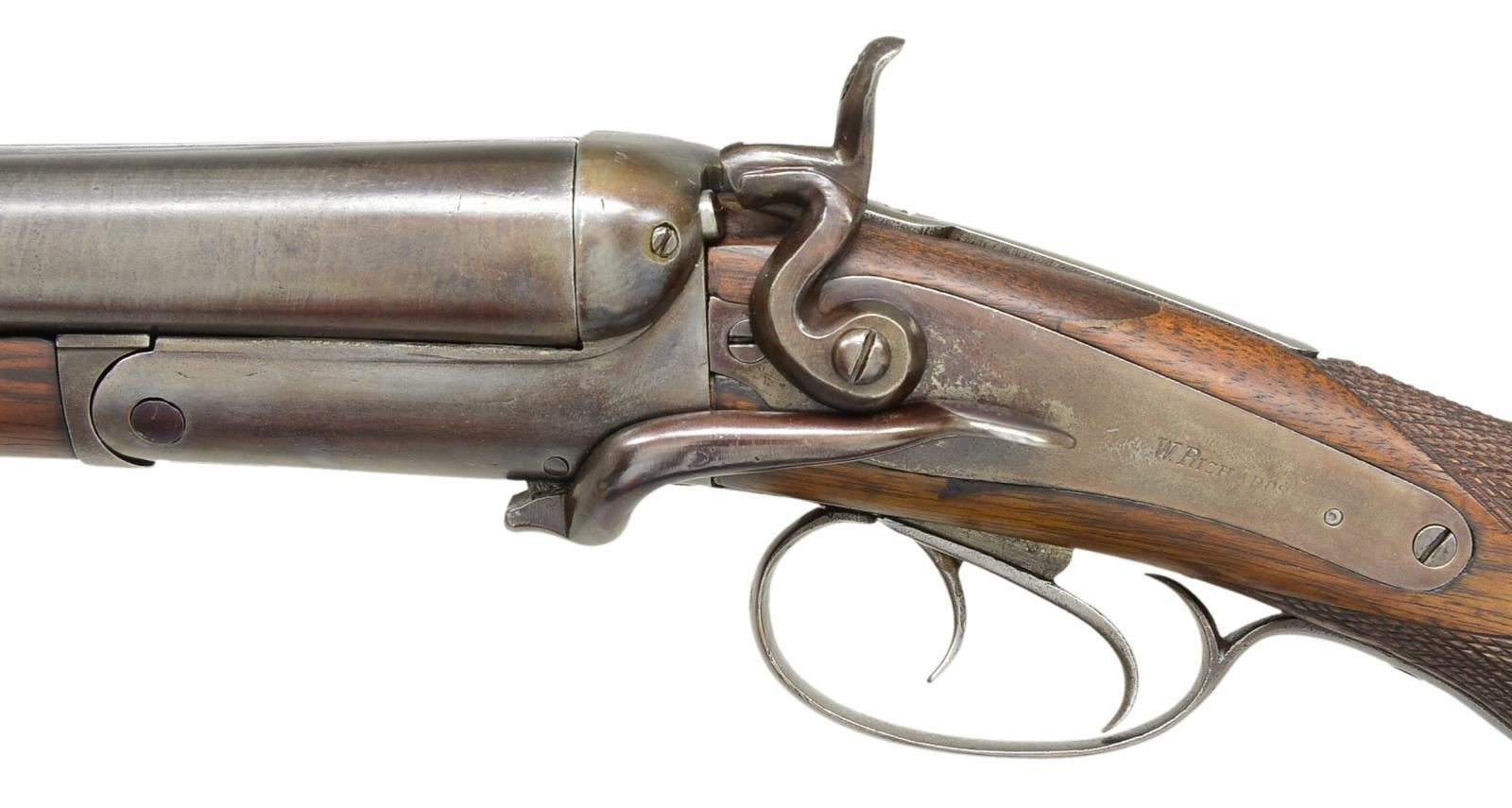 1) W. RICHARDS. Cal. 12 Ga. NSN. Bbls. 30 1/8" of Twist steel w/ Cyl. bores. Side lever exposed hammer action w/ back action locks. Dbl. triggers. Extractors. Walnut splinter forearm & rnd. knob stock w/ checkered wrist. LOP: 13 3/4" over steel shotgun buttplate. Belgium mfg. CONDITION: metal shows evidence of heavy cleaning w/ cold blue touch up. Left bbl. retains an extensive area of light pitting. Bbls. are off face & loose on frame. Locks show wear w/ hammers playing play on tumblers. Pitted bores. Sanded & refinished wood w/ freshened checkering. (01-19003/DS). ANTIQUE.