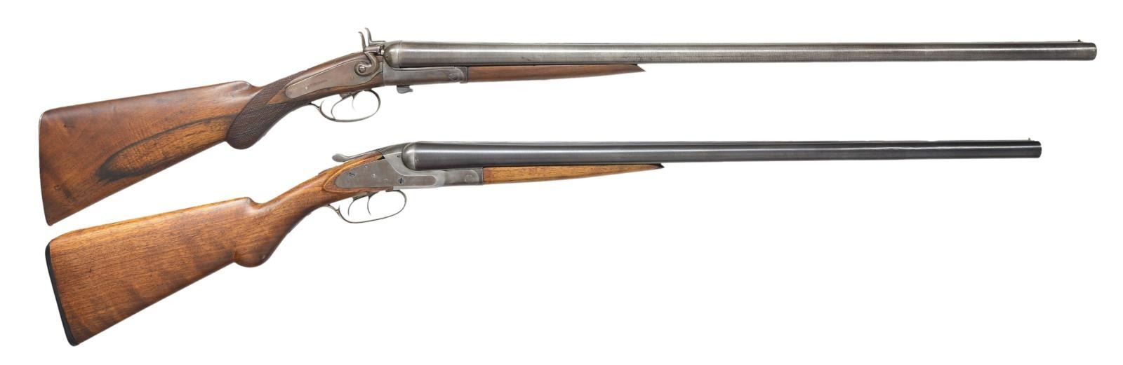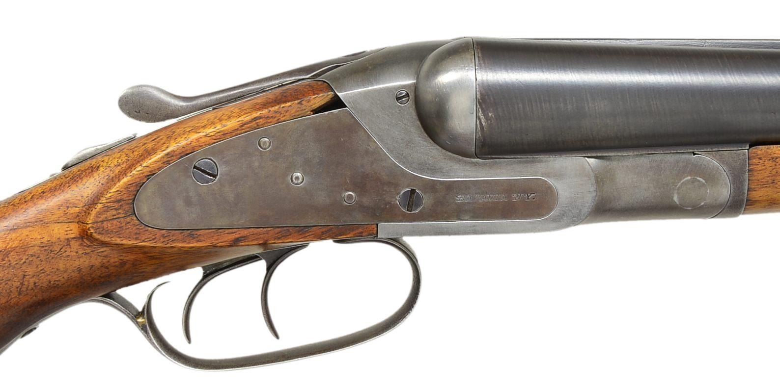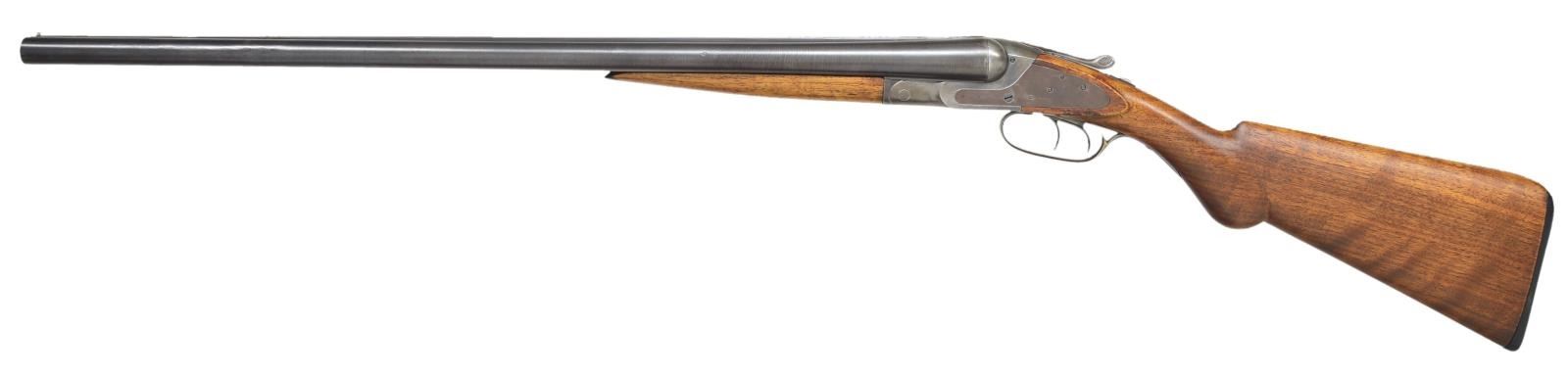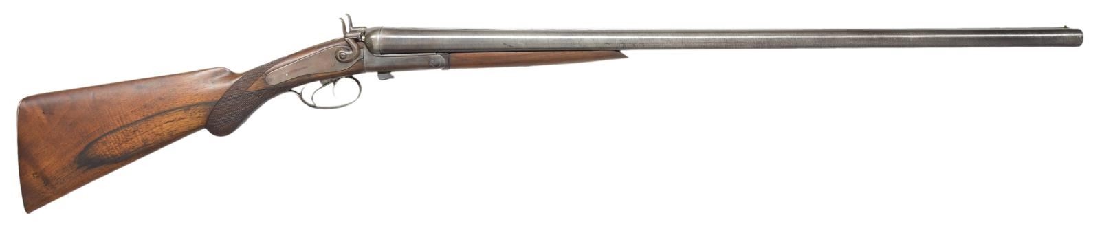 1) W. RICHARDS. Cal. 12 Ga. NSN. Bbls. 30 1/8" of Twist steel w/ Cyl. bores. Side lever exposed hammer action w/ back action locks. Dbl. triggers. Extractors. Walnut splinter forearm & rnd. knob stock w/ checkered wrist. LOP: 13 3/4" over steel shotgun buttplate. Belgium mfg. CONDITION: metal shows evidence of heavy cleaning w/ cold blue touch up. Left bbl. retains an extensive area of light pitting. Bbls. are off face & loose on frame. Locks show wear w/ hammers playing play on tumblers. Pitted bores. Sanded & refinished wood w/ freshened checkering. (01-19003/DS). ANTIQUE.