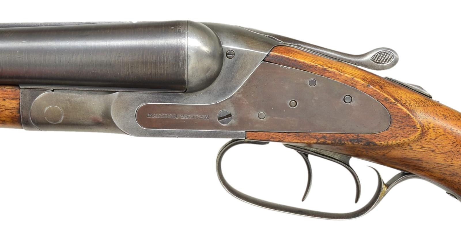 2) BAKER BATAVIA LEADER. Cal. 12 Ga. S# 75704. Bbls. of plain Twist steel shortened to 27" w/ Cyl. bores. Steel front bead. Top lever sidelock action w/ 3 position safety, dbl. triggers & extractors. Splinter forearm & rnd. knob walnut stock. LOP: 14" over hard rubber buttplate. CONDITION: bbls. have dark patina appearance showing evidence of touch up. Sides of rib show heavy indentations 4 1/2" from muzzle. Right bbl. has heavy dents 1", 5" & 14/2" from muzzle. Left bbl. shows evidence of raised dents 6"-7" from muzzle. Pitted bores. Bbls. are slightly loose on frame. Action shows evidence of cleaning & touch up finish. Wood is heavily sanded & refinished w/ traces of checkering remaining. Stock has a chip above right lock w/ smaller chips & cracks extending from the lockplate. (21-1003/DS). CURIO. $400-600.