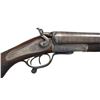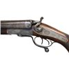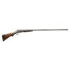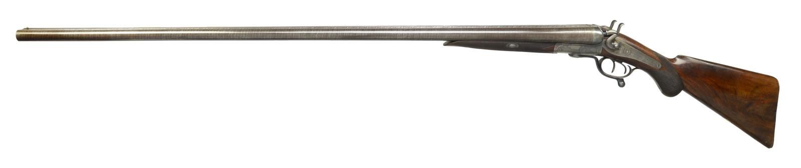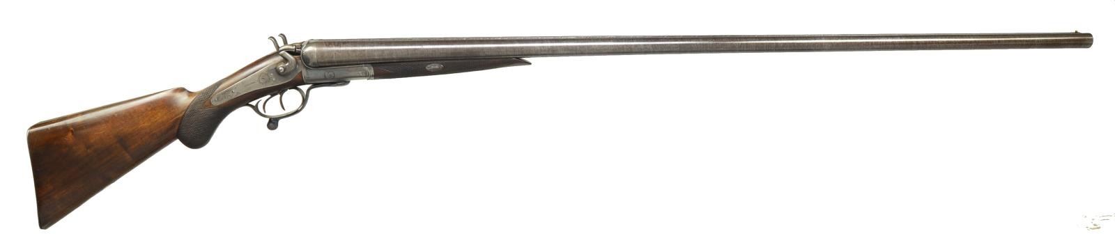 Cal. 10 Ga., 2 7/8". S# 7765. Bbls. 43 1/2" of twist steel w/ brass front sight. Case colored rnd. bodied underlever action w/ back action locks & rebounding hammers. Action & locks have straight line borders & highlights of arabesque scroll hand engraving. Dbl. triggers. Extractors. Bolt fastened splinter forearm & pistol grip stock of fine European walnut w/ hand checkering. Toeline has oval German silver nameplate. LOP: 14" over steel shotgun butt. Bore Diameter: R - .764, L - .755. Choke constriction: R- .003, L - .022. Weight: 12 lb., 14 oz. High quality Belgium mfg. gun made expressly for the market hunting trade. CONDITION: bbls. retain over 90% lightly faded browned finish showing vivid pattern. Action retains over 40% lightly visible case colors. Original wood finish shows wear w/ numerous sm. scratches & marks. Bores are generally bright. Gun is on face & has sound mechanics. (01-18160/DS). ANTIQUE. $1,000-1,500.