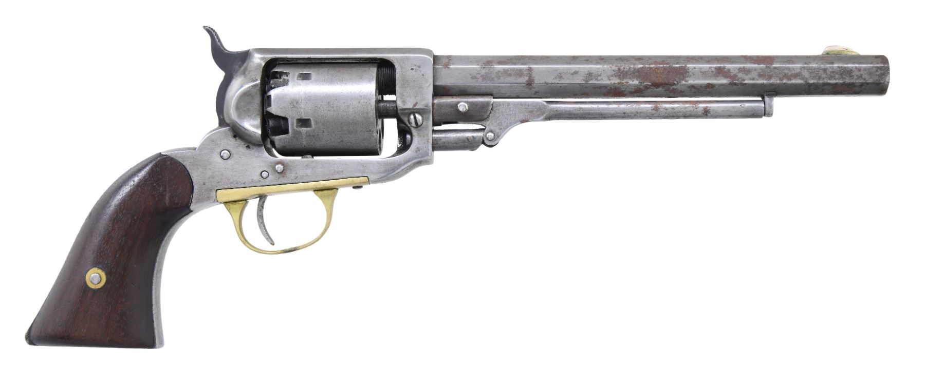 Cal. 36. S# 318. Bbl. 8" octagon w/ German silver blade front sight. Bbl. is marked "WESTERN ARMS Co. N.Y.". Six shot plain round cyl. Original finish was blued w/ brass trigger guard Original walnut grips. Total quantity of about 1,000 mfg. late 1850s to early 1860s. CONDITION: metal is cleaned, having faded to a light gray showing spots of a red rust & corrosion predominantly on the left side of the bbl. Refinished grips. Right panel is rounded at toe w/ crack near the action. Action cycles properly. Cyl. shows some side play. Bore shows sound rifling. (01-26159/DS). ANTIQUE. $1,200-1,800.