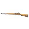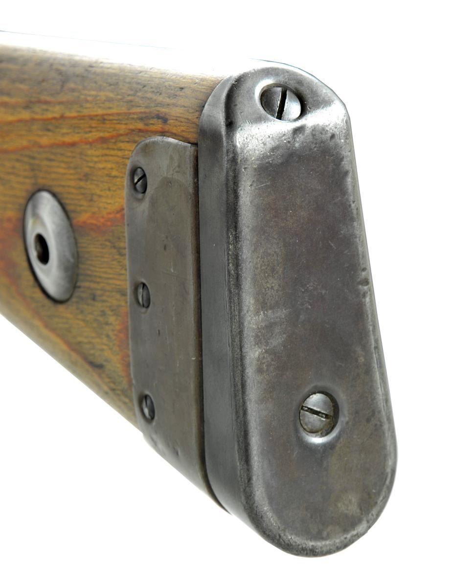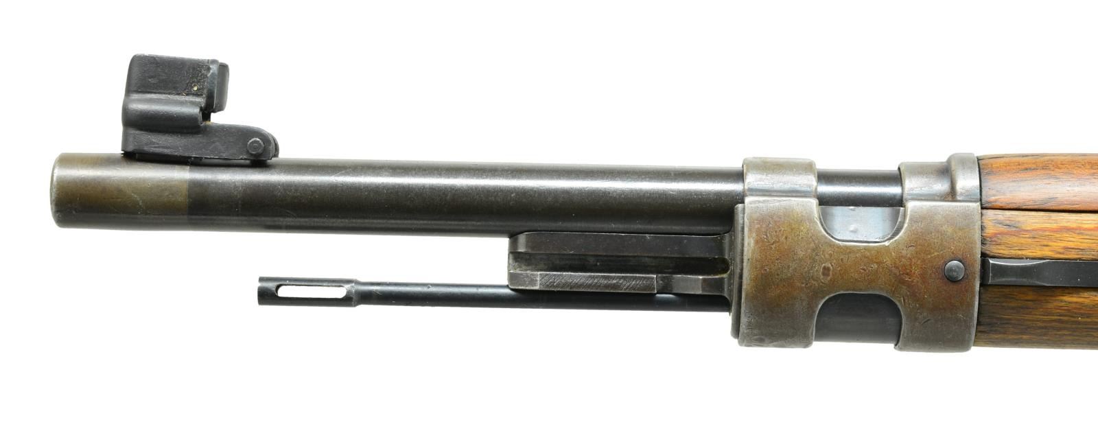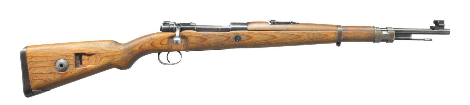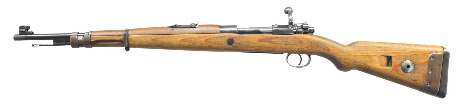 ACTION RIFLE. Cal. 8mm Mauser. S# 8325b. Bbl. 19 3/8". Non matching numbers. Scarce carbine mfg. at BRNO in Czechoslovakia, many of which were issued to German mountain troops. This particular specimen has scratches inscription on buttstock, protective plate on left side "FALLSCHIRMJAGER 741 (????) KURSK" & "43". Receiver marked on left rail "G.33/40". Receiver ring marked on top w/ waffenamt "653", "dot" & "1942". Turned down bolt handle w/ hollow knob. Bolt handle marked underneath w/ "N5". Tangent rear sight graduated to 1000 meters. Inverted V front sight. Fitted w/ non standard sight protector. Front sight is mounted on 1 1/8" sleeve which is attached to muzzle end of bbl. Sleeve is not rifled. Cleaning rod & bayonet lug are present. Has provision for side sling. Laminated buttstock & walnut handguard. Buttstock has steel takedown hole, cup type buttplate & sheet metal stock protector fitted to left side. CONDITION: stock set has early arsenal rework type finish w/ markings rendered illegible. Handguard has lg. crack at top between bbl. bands. Metal has been cleaned, turning gray w/ traces of original blue. Muzzle sleeve has notable gray appearance. Bore has worn lands turning dark in grooves. (21-2800/RW). CURIO. $800-1,200.