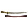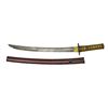 Overall length: 24”. Blade length: 17 1/8”. Blade is out of polish, therefor has an indiscernible hamon. Brass diagonally incised habaki. The nakago has one mekugi-ana and is unsigned. There is one seppa below the exceptionally beautifully decorated blackened brass tsuba. Decoration includes various types of floral & foliate embellishments, with the lower left section being stylized waves. The fuchi & kashira are blackened and matched. The tsuka-ito is a deep brown/gold. White same with interesting bicolor menuki. Saya is red lacquer with matching kojiri & koiguchi. The kogatana is missing. CONDITION: blade has a dark overall patina with a tiny bit of oxidation at the tip. No major faults can be seen on the blade. The tsuba, tsuka, & menuki are excellent. Beautiful saya with minor lacquer loss. (02-21849/BF). $400-700.