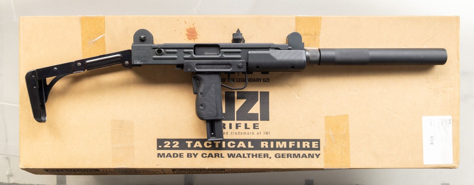 Cal. 22 LR. S# W1004514. Mfg. by Walther Arms in Germany & Imported by Umarex of Fort Smith, AR. Bbl. 17" having a barrel shroud similar to suppressor. Matte black finish. Black composite grip assembly. Folding steel stock. MAGS: 1 -10 rd. UNATTACHED ACCESSORIES: matching factory box & manual. CONDITION: gunsmith attention needed as plastic grip assembly is broken & separating. Near excellent metal & composite finish with light handling marks. Near excellent rifling. (25-5463/MD). MODERN. $200-400.