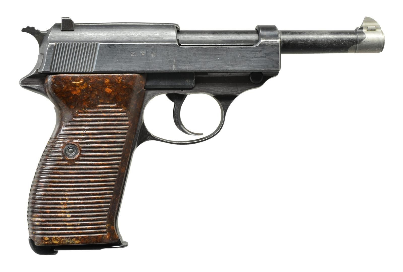 Cal. 9mm Luger. S# 437a. Bbl. 5" w/ matching # oddly stamped w/ 4 at far left & 37 at far right plus "a" w/ lower case type set appearance rather than script. Matching locking block w/ "A". Eagle 359 & eagle party symbol proofs. Coarse grooved hammer spur. Mottled brown Bakelite grips. Mfg. 1945 at end of production w/ wartime unpolished finish & 1 line ac 45. MAGS: 1 very good 8 rd. marked on left side w/ P.38vU plus eagle 359 proof at top of spine. CONDITION: good basic appearance but front portion of bbl. to include sight has noticeable area w/out finish as if by chemical removal. Minimal high edge wear on slide. Light grip area wear. Occasional finish rub marks throughout slide. Very good plus grips. Near excellent bore. (22-67/NW). CURIO. $500-750.