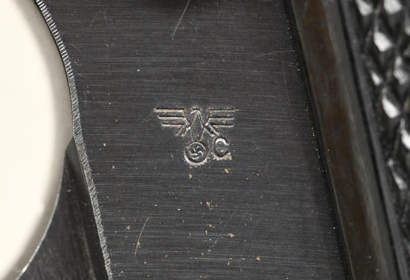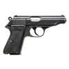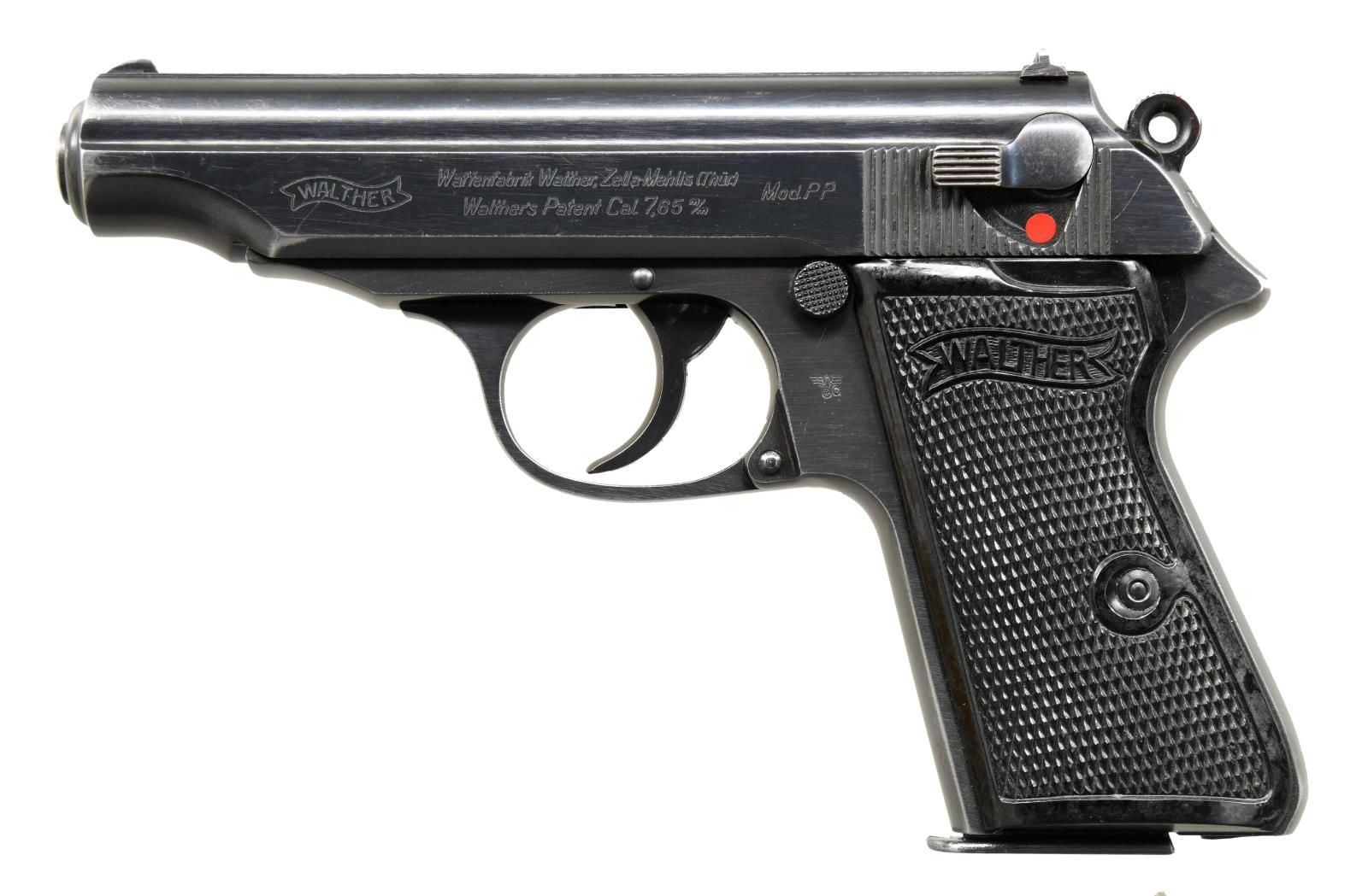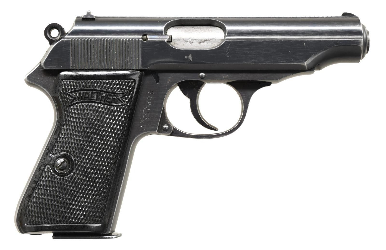 Cal. 7.65mm. S# 208425P Bbl 3 78”. Standard configuration Walther PP, high polish finish, as used by the German police in WWII. Left side of slide marked with the Walther banner suffixed by two line address referencing manufacturer, location, caliber, and model. Eagle/N on exposed chamber, right side of barrel near muzzle, and slide. Full serial number on right side of frame. Fire blued 60 degree safety, red dotted for fire position. Loaded indicator present. The gun is marked the Eagle/C on the left side of the frame. Fitted with Walther banner black plastic panels secured with a single transfer screw. Matte finished magazine with seven indicator holes, left side marked with Walther banner/PP 7.65mm”, flat base. CONDITION: approximately 90-95% original high polish salt blue finish with expected holster wear and fading of the front and back straps. Comparable fading over the fire blued safety. Crisp grips with no chips or splits. Excellent magazine. Mirror bore with sharp rifling. Perfect manual mechanics. PROVENANCE: The Collection of Gun Sport Ltd owned by Jon R. Thomas. (23-4438/LA). CURIO. $1,500-2,250.