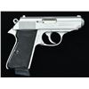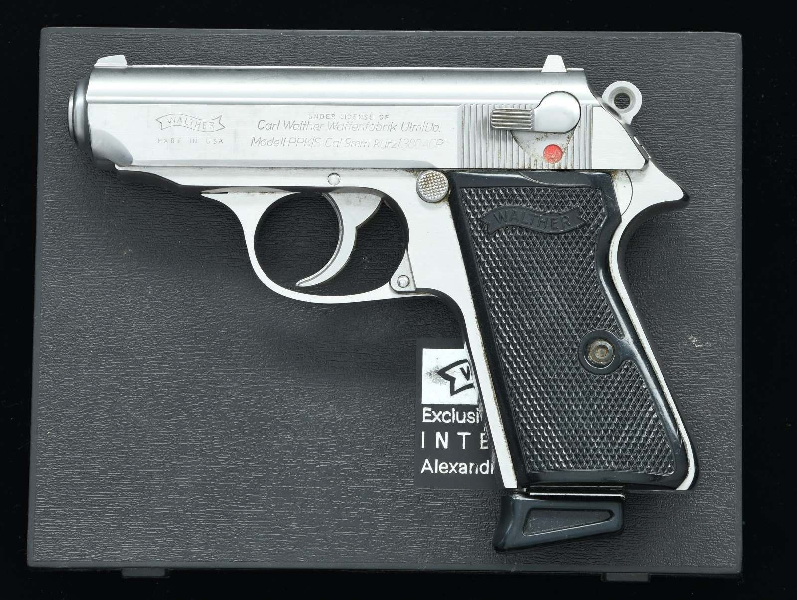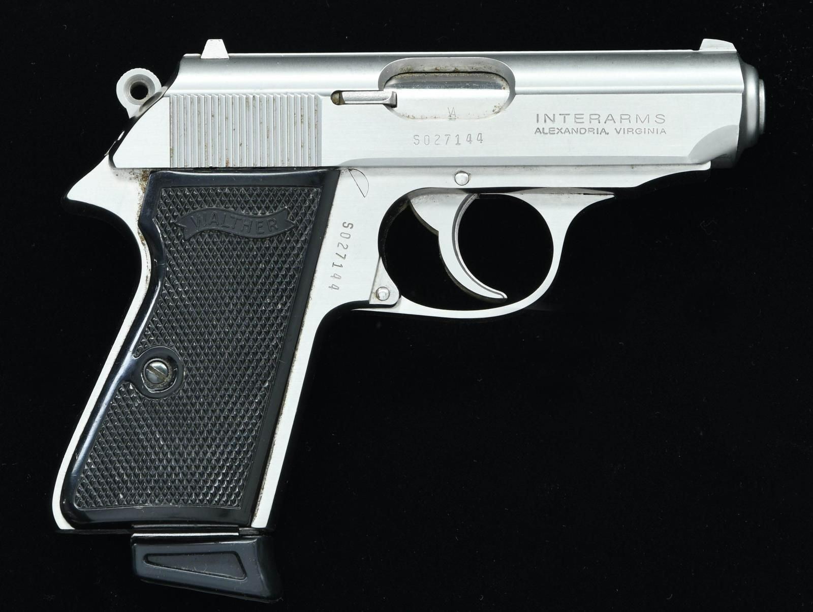 Cal. 380 ACP. S# S027144. Bbl. 3 1/4". Blade front sight w/ orange dot. Fixed rear sight w/ orange stripe. Interarms USA assembled pistol under Walther license. Matching numbers on slide & frame. Stainless finish. Walther Banner grips. MAGS: 3-7 rd. stainless & 8-7 rd. blued. Some mags have black baseplate, some do not. UNATTACHED ACCESSORIES: factory black hardcase w/ faintly numbered label that appears to match the gun, manual, factory target & other paperwork. CONDITION: grips show some handling wear & dings. Metal shows some light scratches, handling wear & sparse oxidation specks. Very good bright bore. (23-2633/MJC). MODERN. $400-600.
