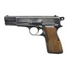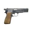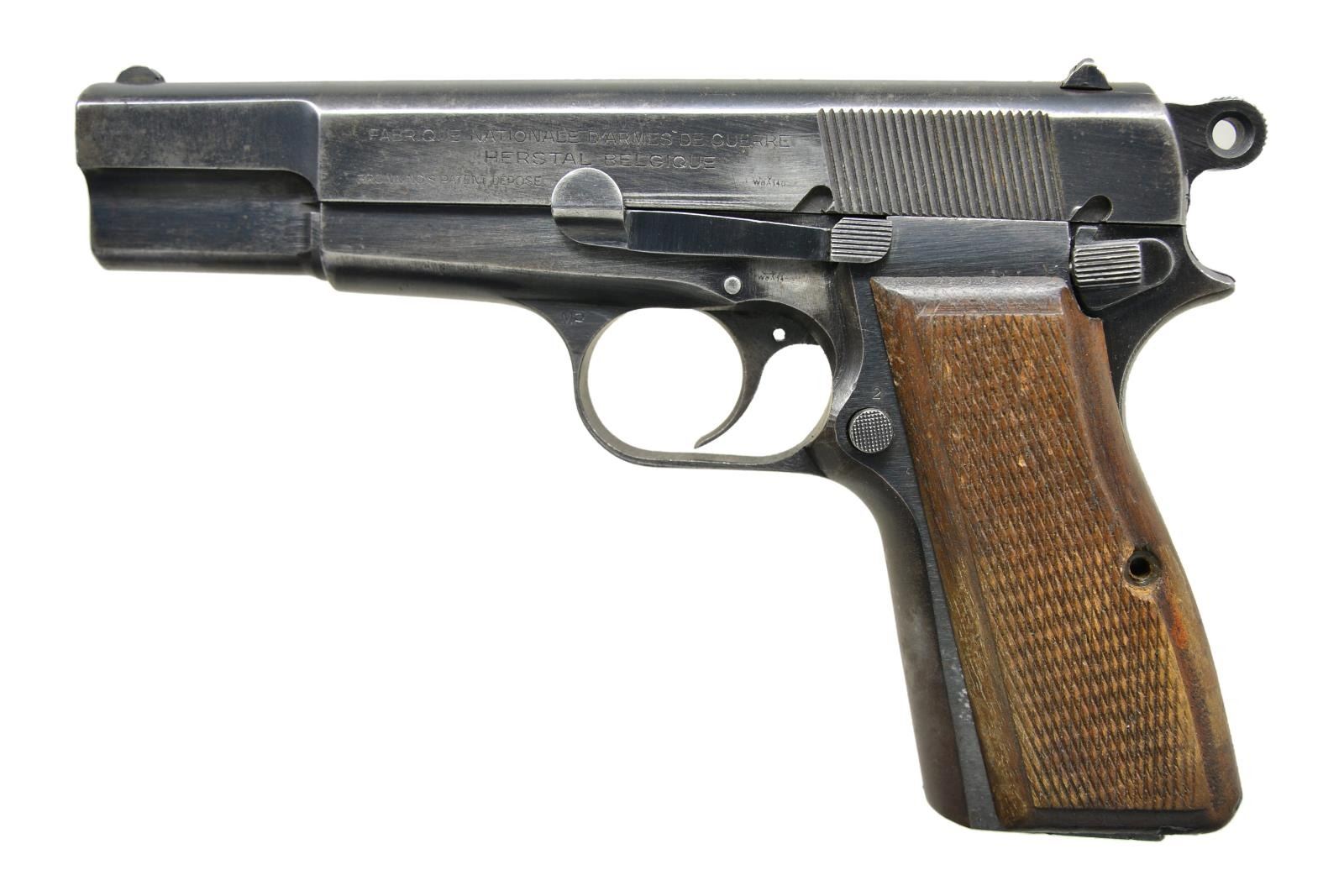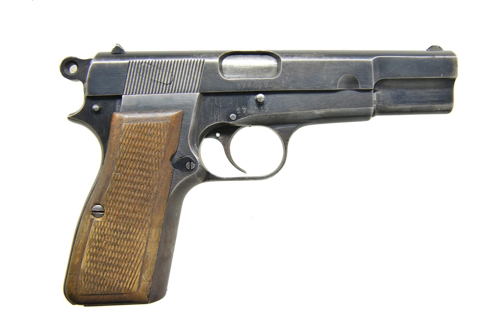 Cal. 9mm. S# 176047. Bbl. 4.6". Serrated ring hammer w/ thumbprint feature. Internal extractor. Serrated slide. Fixed sights. This Belgium-made example bears the Waffenamt code "WaA140", indicating it was produced at the Belgian factory during the German occupation. Left side controls. Modified magazine disconnect safety. Blued finish on exposed metal surfaces. Checkered hardwood grips. Left side of slide marked: “FABRIQUE NATIONALE D’ARMES DE CUERRE / HERSTAL BELGIQUE / BROWNING’S PATENT DEPOSE WaA140” & German eagle. Left side frame marked “MR” on triggerguard, “WaA140” & German eagle above trigger on both frame & slide. Right side markings include: matching S# “176047” on bbl., slide & frame in parallel. CONDITION: blued finish demonstrates period thinning, primarily on high spots & edges as well as 2 spots above trigger on both frame & slide. Markings are clear & easy to read though it appears to have been refinished at some point. Front strap of pistol appears to have succumb to an early patina, brought under control long ago. Bore is clean w/ strong rifling. Fire control mechanism appears to function correctly when cycled by hand. (22-3837/JZ). CURIO. $400-600.