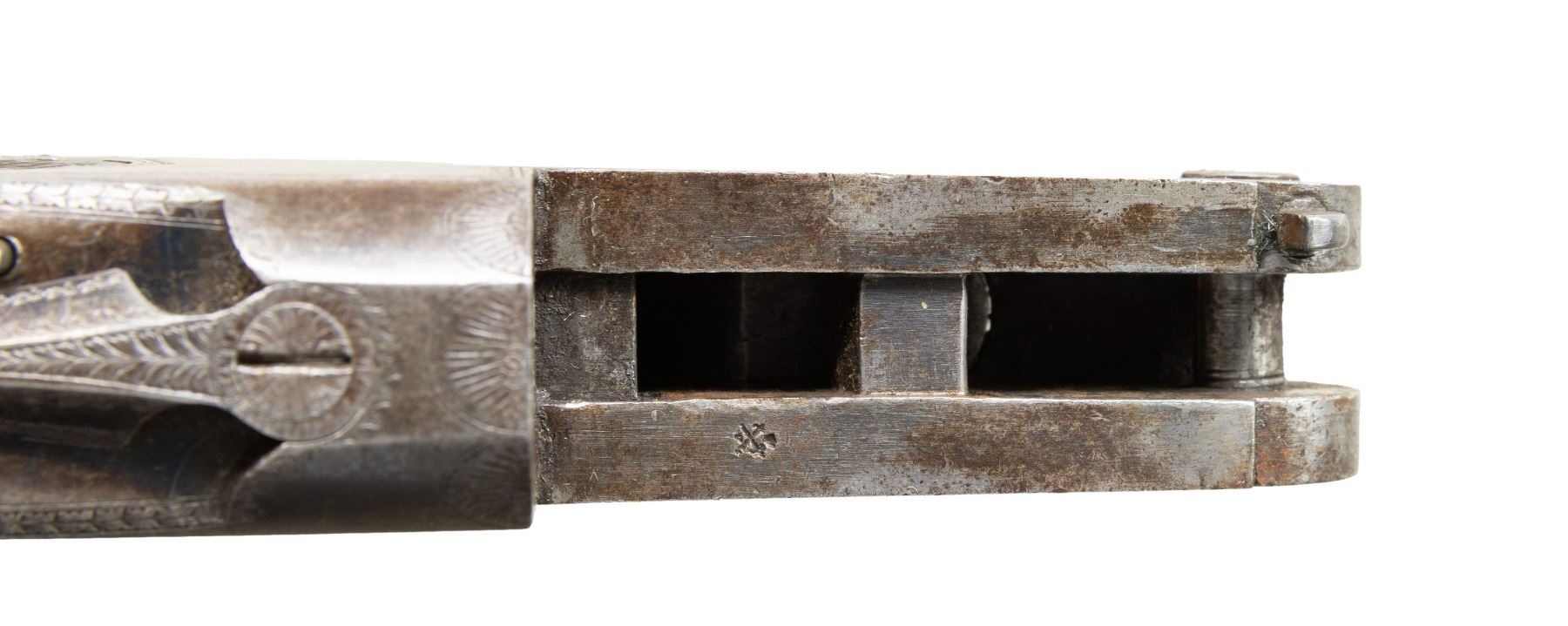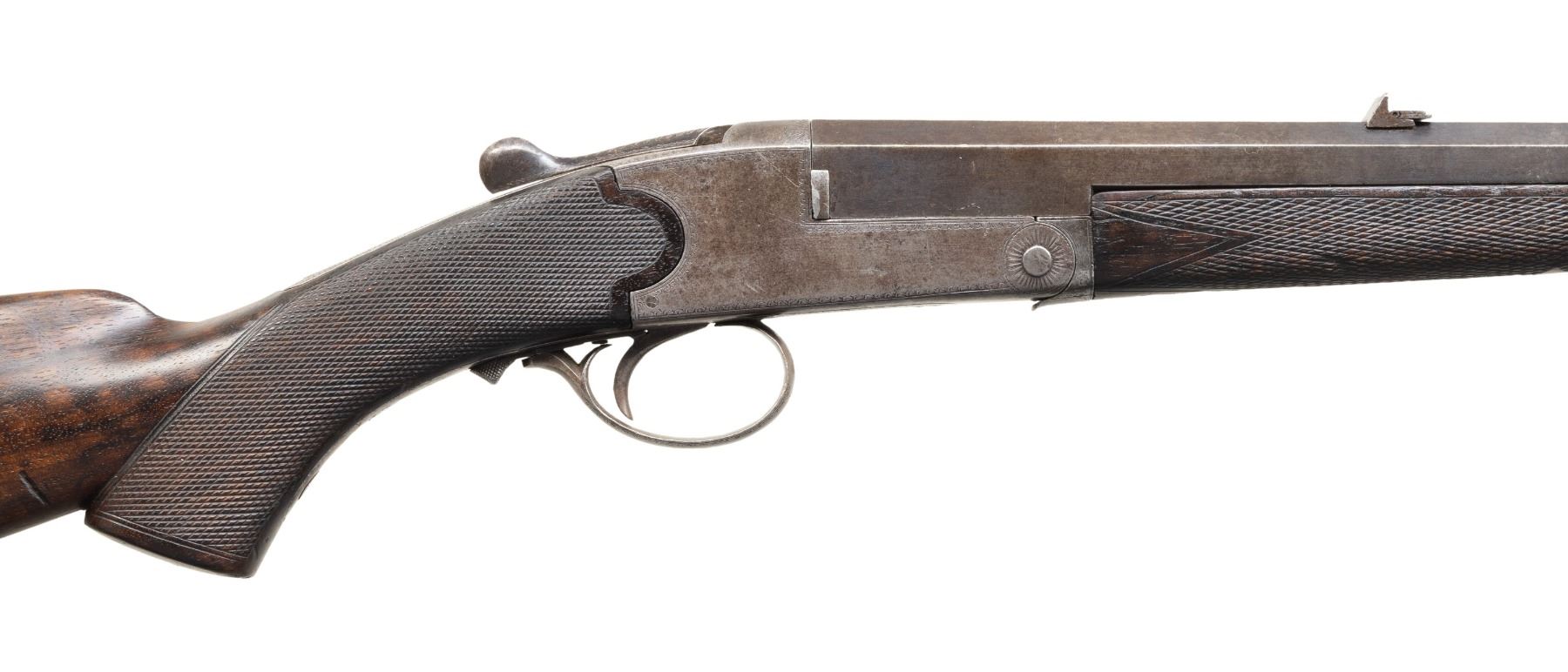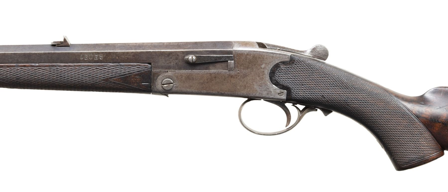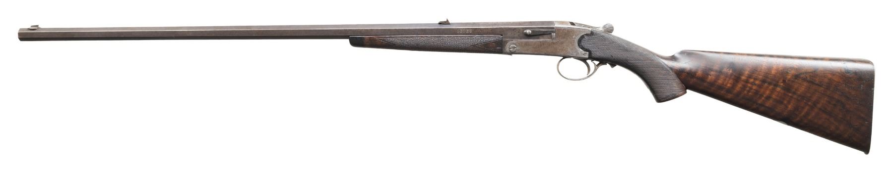 Cal. 300 Rook. S# 12035. Oct. 26" bbl. w/ Birmingham black powder proofs. Barrel top flat is matted w/ blade front sight & 3 leaf folding rear sight. Boxlock top lever action w/ extractor & highlights of geometric pattern engraving. Checkered walnut stock set w/ ebony forearm tip, German silver toeline name plate, matching number stamped on toeline & metal shotgun buttplate. CONDITION: metal has gray/brown patina appearance with marks & spots corrosion; traces of blue on barrel. Wood has good appearance with numerous dings. Good strong rifling showing pitting & wear near muzzle & chamber. PROVENANCE: Estate of Groves Herrick. (25-5713/MD). CURIO. $400-600.