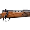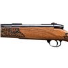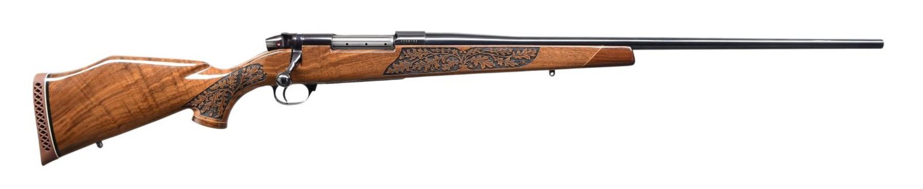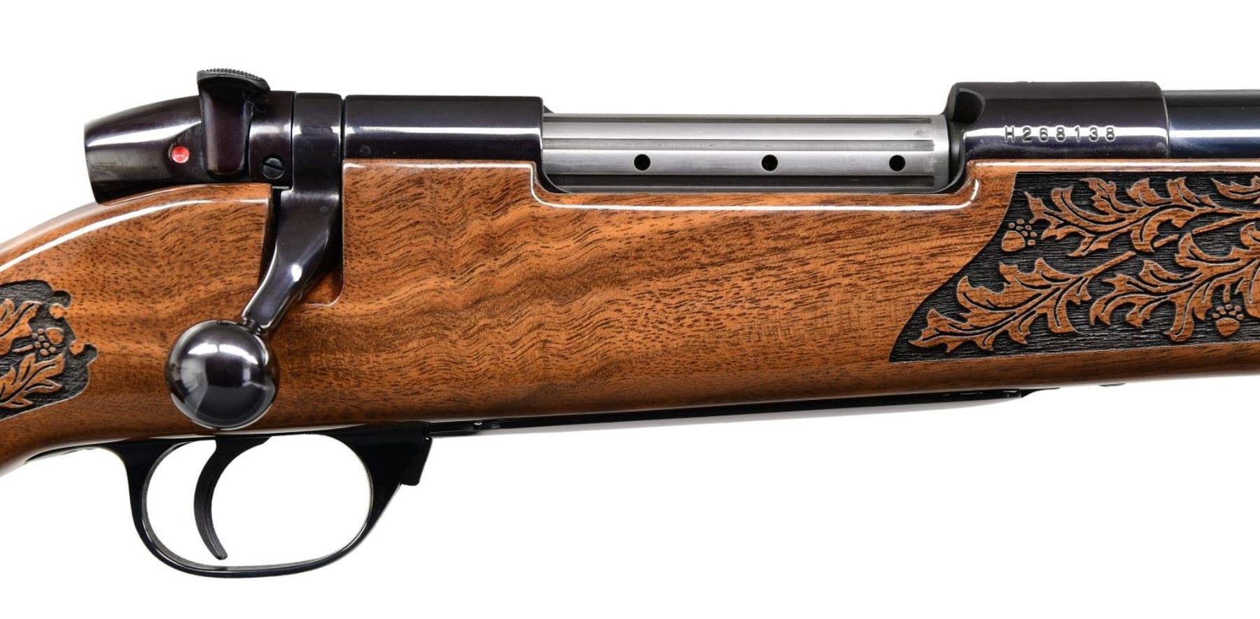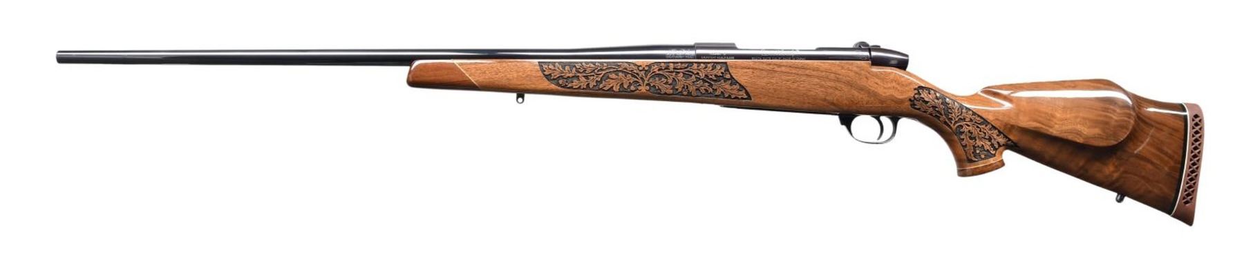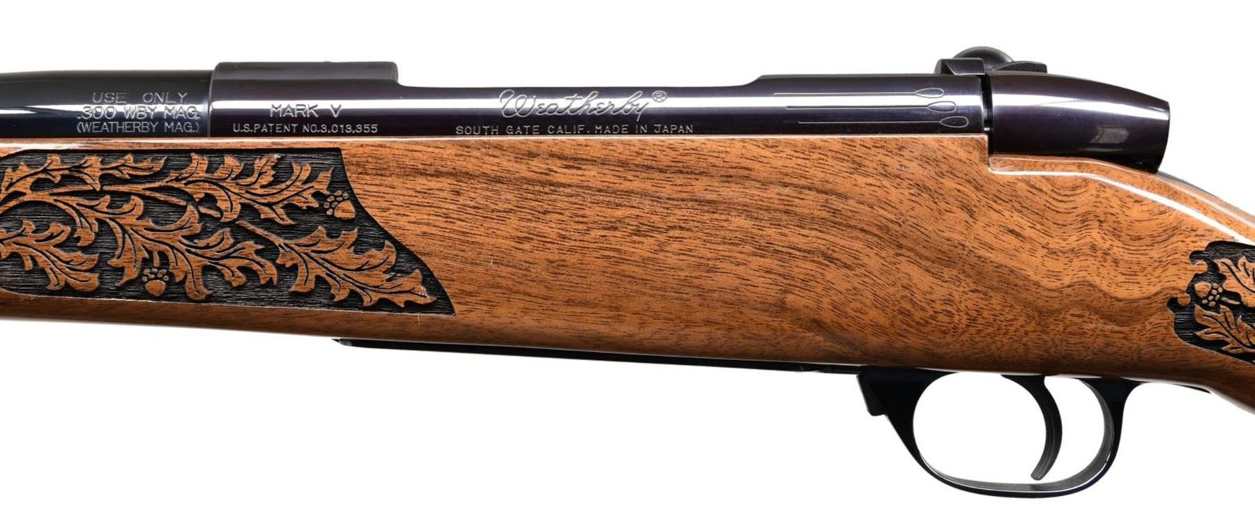 Cal. 300 Wby Mag. S# H268138. Bbl. 26 1/4". Mark V Lazermark bolt action rifle, mfg. in Japan and imported/retailed by Weatherby. Left side of bbl. is marked "USE ONLY/ .300 WBY MAG./ (WEATHERBY MAG.)" at the breech. Left side of the receiver is marked "MARK V", followed by the Weatherby trademark logo above Weatherby's importer information and "MADE IN JAPAN", with the S# marked on the right side of the chamber. Metal components exhibit a lustrous blue finish overall, save for the aluminum trigger guard, which shows a glossy black finish. Wood Monte Carlo pistol grip buttstock features oak leaf and acorn relief engraved panels on either side of the grip and forearm. CONDITION: metal components retain virtually all of their original factory finishes, exhibiting few superficial handling marks. Mirror bore, exhibiting well-defined rifling throughout. Stock is excellent overall. (24-1844/MLW). MODERN. $1,200-1,800.