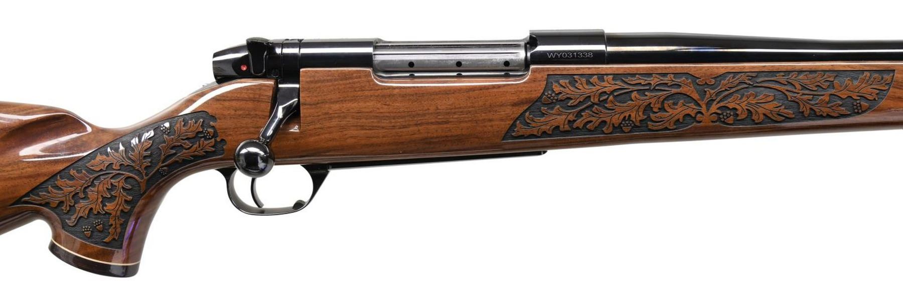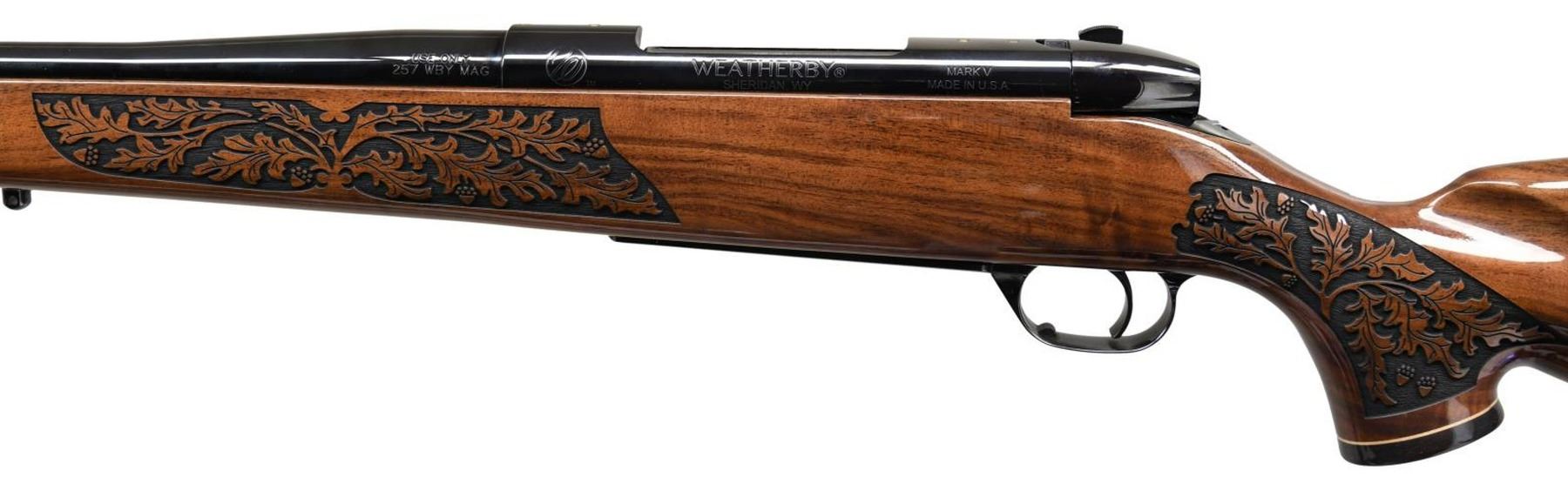 MATCHING FACTORY BOX. Cal. 257 Wby Mag. S# WY031338. Bbl. 26". Mark V Lazermark bolt action rifle mfg. by Weatherby. The left side of the bbl. is marked with the cal. designation. Left side of receiver exhibits the encircled Weatherby logo, followed by "WEATHERBY/ SHERIDAN, WY", as well as the model designation above "MADE IN U.S.A.". Metal components exhibit a lustrous blue finish overall. Checkered Claro walnut Monte Carlo pistol grip buttstock features 5 oak leaf and acorn laser engraved panels. Receiver is factory drilled and tapped and bbl. is factory threaded. UNATTACHED ACCESSORIES: matching factory box. CONDITION: near new, with metal components retaining virtually all of their original factory finish overall. Mirror bore, exhibiting well defined rifling throughout. Stock is excellent overall. Box shows some mild exterior wear from handling and storage, but otherwise remains sturdy and serviceable. PROVENANCE: the Collection of Gun Sport Ltd owned by Jon R. Thomas. (23-3237/MLW). MODERN. $2,000-3,000.