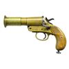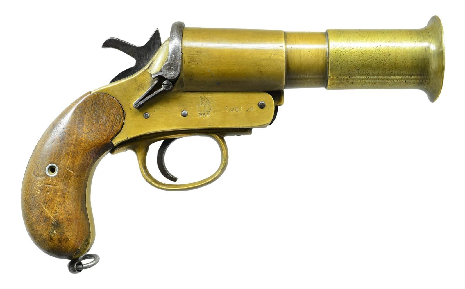 Cal. 26mm. S# 106136 (1918). Bbl. 5.75" w/ flared muzzle. Brass construction. British military proofs on left side. 2 Piece walnut grips. Lanyard ring at butt. CONDITION: good overall w/ patina, marks & cleaned pitting. Good grips w/ worn finish. Good bore w/ fouling. (02-16819/MD). NON GUN. $350-500.