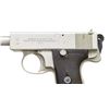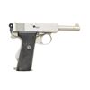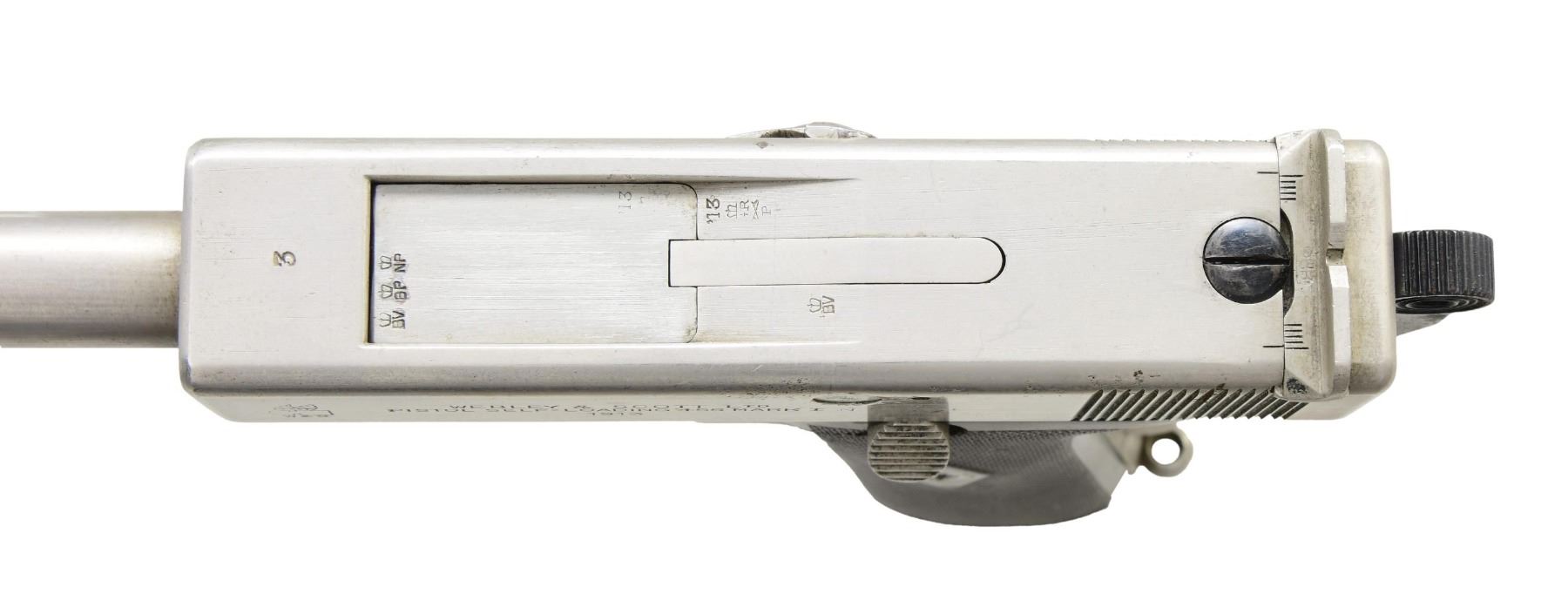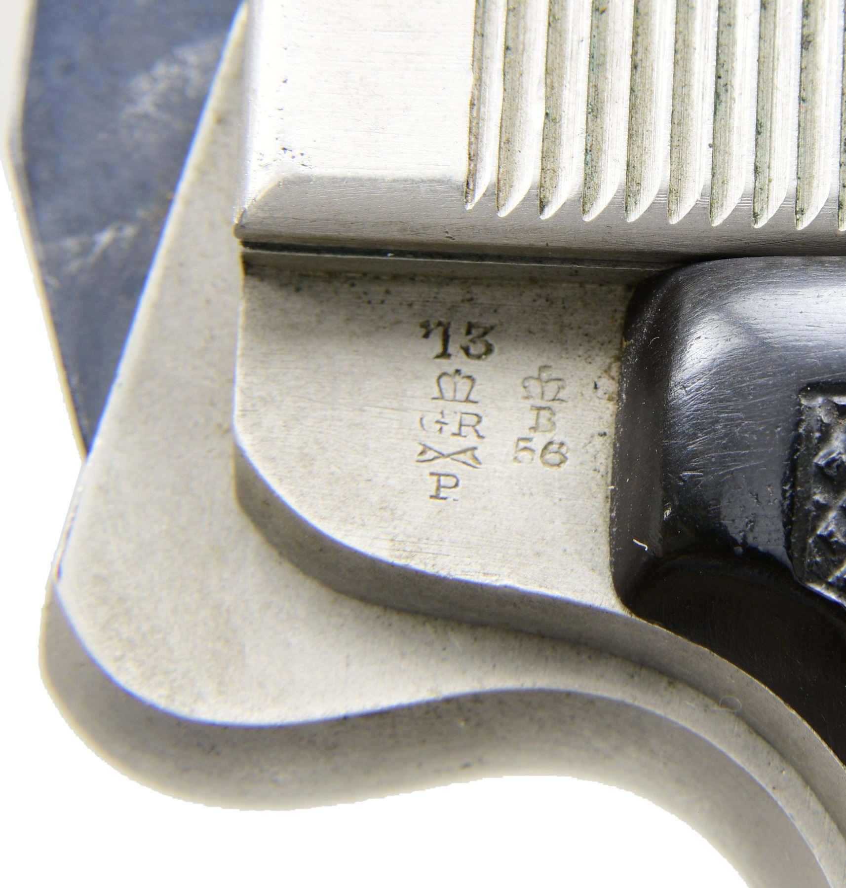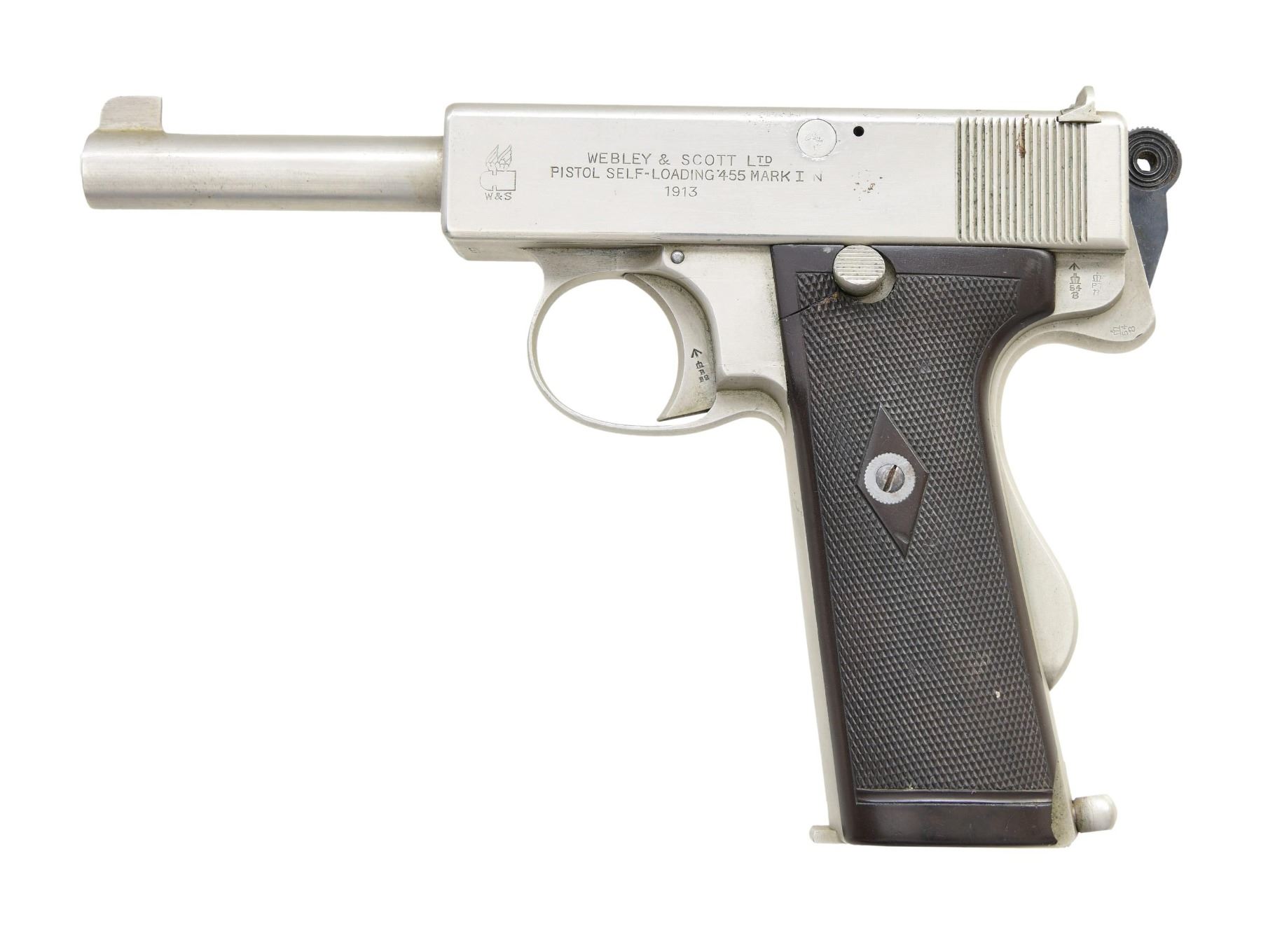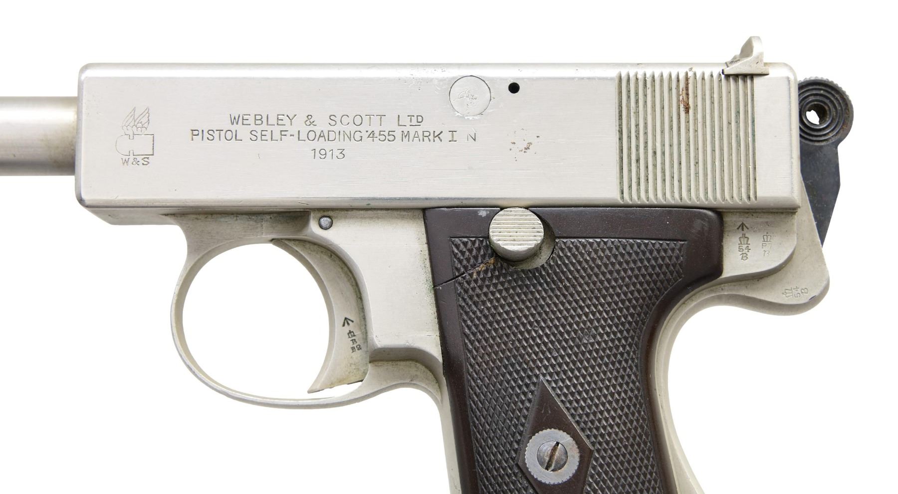 Cal. 455. S# 637. Bbl. 5". Mark I semi-automatic pistol, mfg. by Webley & Scott under contract for the British Navy. The left side of the slide is marked with the Webley & Scott winged bullet logo above "W&S", followed by "WEBLEY & SCOTT LTD/ PISTOL SELF-LOADING 455 MARK I N/ 1913". Slide and frame exhibit Birmingham nitro proofs, with military proofs scattered overall. Metal components (save for the hammer) have been cleaned and are in-the-white. Frame is mounted with 2-piece checkered vulcanite grips. Recoil lever bar / breech stop has split into two pieces and exhibits a previously welded repair. Due to breakage, slide and bbl. S#s cannot be verified. Left grip panel is a replacement and features finer checkering than the right panel. MAGS: one 7-rd. CONDITION: metal components are very good, as cleaned and in-the-white, exhibiting some areas of light to mild pitting, some scattered handling marks, as well as some light age-related discoloration. Dark bore, exhibiting consistent pitting while retaining fair rifling throughout. Grips exhibit smoothing and scattered marks from handling and storage, with a chip and a crack present on the left panel. (24-4082/MLW). CURIO. $2,000-3,000.