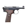 Cal. 380 ACP. S# 55615. Bbl. 3 1/2". Blade front sight. Replacement square-notch rear sight. Reblued finish, with some markings being faint. Checkered walnut grips. MAGS: one 7-rd. CONDITION: right grip panel shows a 3/4" crack at top; grips otherwise show some scattered dings, checkering wear, and handling marks. Metal retains 95% reblue with some edge wear, blued-over pitting, and small oxidation spots. Action appears to function properly when hand-cycled. Worn bore with scattered frosting and pitting. PROVENANCE: from the lifelong collection of Bill Peterken. (24-6105/MJC). CURIO. $200-300.