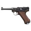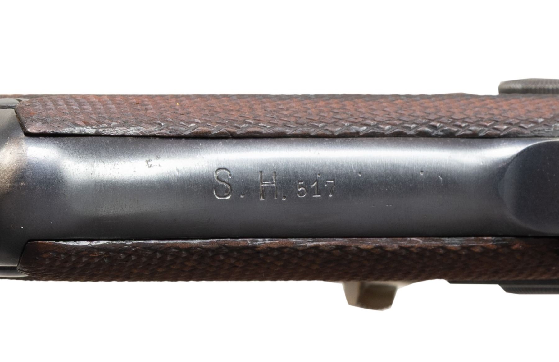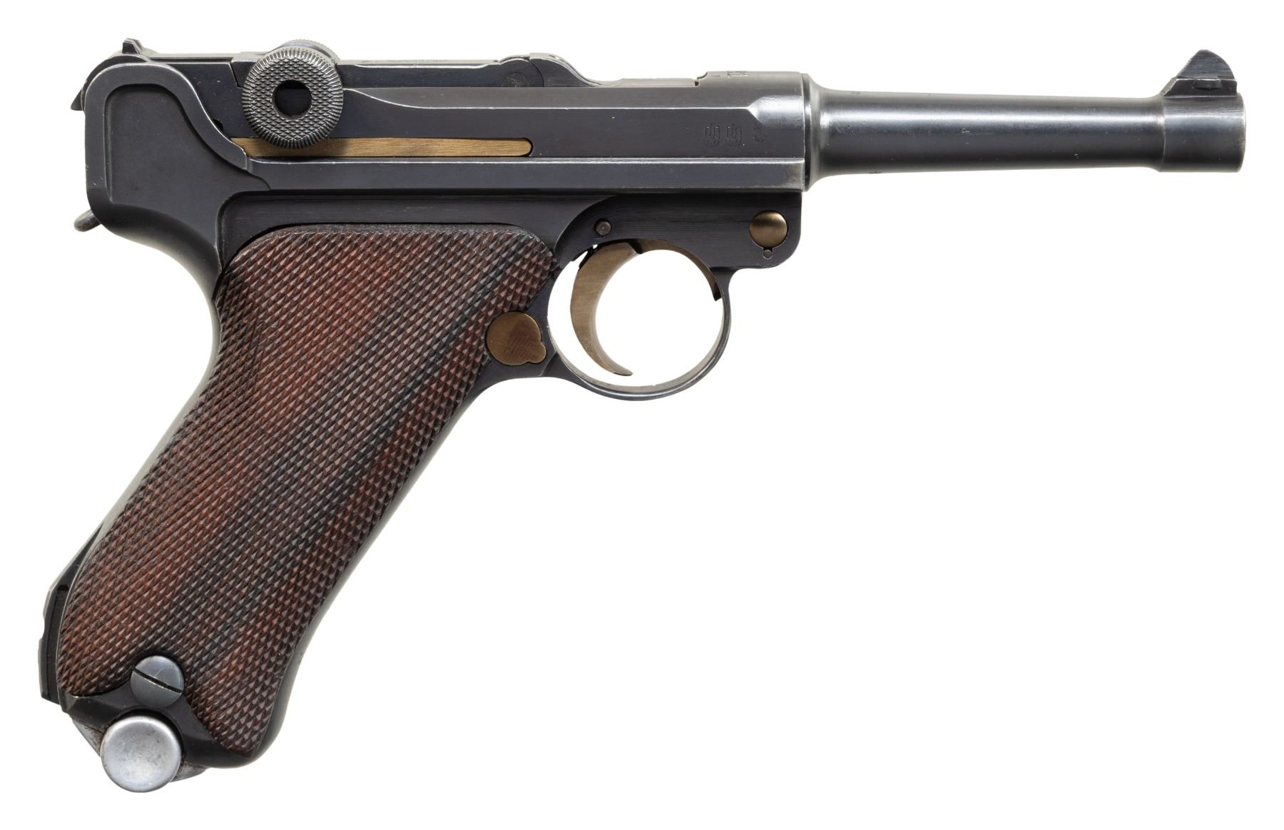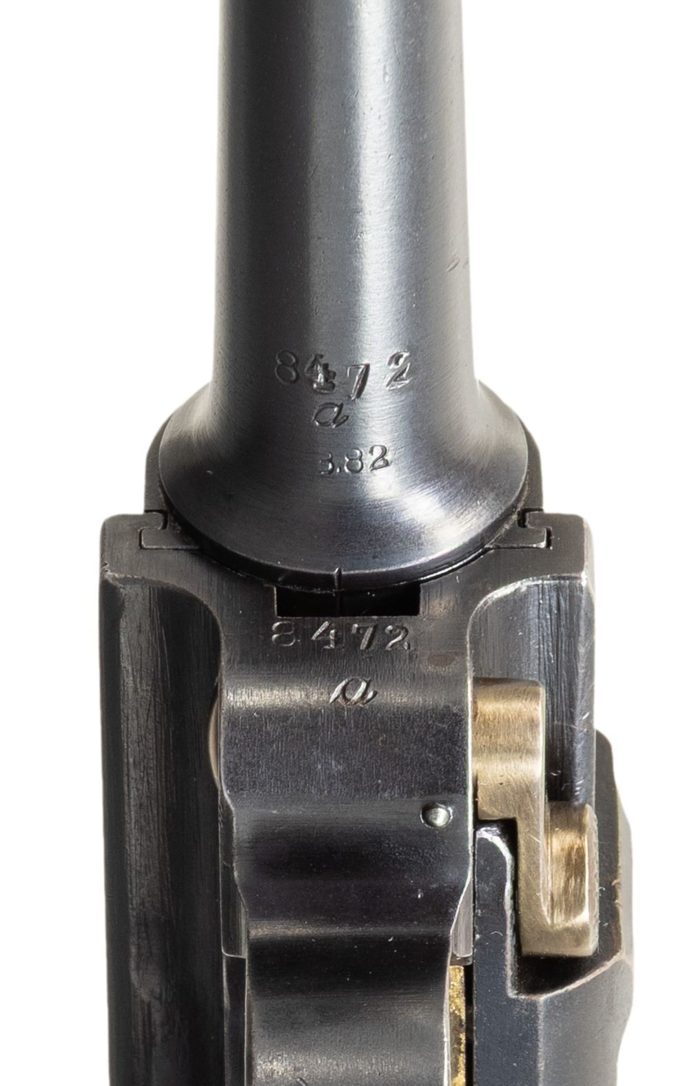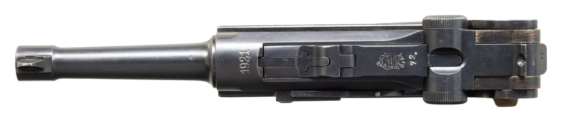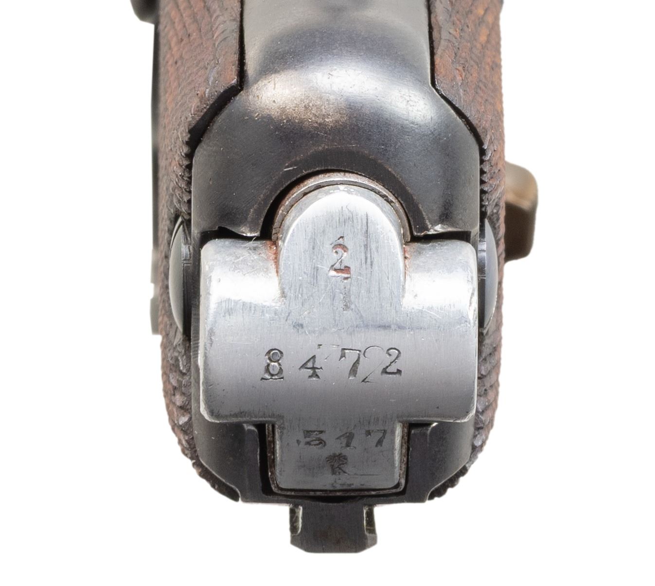 SEMI-AUTOMATIC PISTOL. Cal. 9x19mm. S# 8472a. Bbl. 3 15/16". P.08 Luger semi-automatic pistol mfg. by DWM in 1921 for police use. Top of the bbl. extension is marked "1921" over the chamber, with Weimar Eagle/WaA4 (Procurement Office 4) proofs marked on the right (single Eagle/WaA4 proof repeated on bbl. and left side of breechblock). Toggle is marked with the intertwined "DWM" monogram. Front grip strap is police unit marked "S.H.517" indicating issue to Schutzpolizei Hannover (Protection Police Hannover District). Metal components exhibit a rust blue finish overall, save for on the takedown lever, trigger, safety lever, and extractor, which exhibit a reheated straw finish. Frame is mounted with 2-piece checkered wood grips. Standard dovetailed blade front sight and fixed V-notch rear sight. Bbl. extension is fitted with a police Schiwy sear safety, with the frame featuring a clipped Walther trigger safety. All serialized parts are matching and include the frame, takedown lever, sideplate, trigger, safety lever & bar, bbl. bbl. extension, trigger bar, breechblock, extractor, firing pin, toggles, as well as the rear toggle pin. Grips are matching via "72" on the interior of the panels, marked below an Imperial German military proof and another indiscernible 2-digit set of numbers (likely during the period). Hold-open latch is unnumbered. MAGS: 1 matching 8-rd. with aluminum plug. Plug was renumbered, seemly during the period, and is marked "2/ 8472/ 517" above a police Starburst/K proof. CONDITION: metal components retain the vast majority of their original (or period police arsenal applied) blue finish, exhibiting some light to mild edge wear, a few scattered small spots of light wear, as well as some scattered spots of light surface oxidation overall. Strawed parts are excellent as reheated. Bore is bright, exhibiting consistent light pitting, while retaining strong rifling throughout. Proper manual mechanics. Grips are very good to excellent, showing some spots of smoothing, as well as some small nicks and minor handling marks overall. (25-6061/MLW). CURIO. $1,000-1,500.