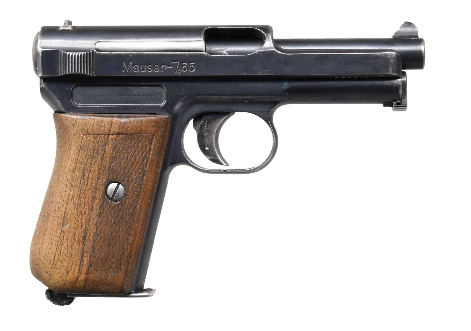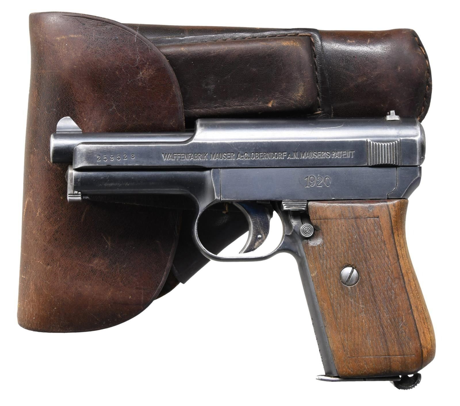 PISTOL. Cal. 7.65mm (32 ACP). S# 259528. Bbl. 3 1/2". Blade front sight and U-notch rear sight. Left side of the frame has a Weimar government "1920" stamp. The front strap is marked "L.K.153," possibly for Landjagerkorp of Wurttemberg. The visible numbers match. Blued finish. Checkered walnut grips. MAGS: 1-7 rd., marked with the Mauser banner on the baseplate. UNATTACHED ACCESSORIES: brown leather holster marked "MAUSER 7.65" in blue ink on the inside. CONDITION: grips show worn checkering with a small crack at the bottom rear, some scratches, and handling marks. Metal retains 80% of its original blue with scattered edge wear and fading. Very good, bright bore. (24-1075/MJC). CURIO. $300-400.