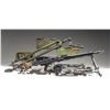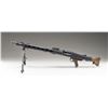 KIT. MG-42 GPMG (General Purpose Machine Gun) display gun / parts kit assembled on a milled steel receiver. Gun appears to be assembled from a variety of war time and post-war parts. Bbl. is marked "cyw" over an encircled "cyq/ 1", a stylized "cyq" and a German Eagle/15 proof, with a boxed "K-5" proof stamped on the side. Metal components exhibit a reapplied blue finish overall. Post-war wood buttstock with 2-piece grooved brown synthetic grips. Standard flip-up blade front sight and tangent V-notch rear sight graduated 2-20. German WWII "1943" dated folding bipod. No matching numbers. Bolt assembly and charging handle are absent. UNATTACHED ACCESSORIES: x1 post-war MG-42/MG3 Anti-Aircraft tripod, x1 unmarked MG-34 Gurtfulller 34 belt loader (coated in a thick layer of old cosmoline) in ammunition can, x1 "10/77" dated German MG3 belt loader in ammunition can, x2 MG42 50-rd. "basket" drum mags. in carrier (mags. and carrier with green painted exterior), x1 blued steel 50-rd. "basket" drum mag., x6 50-rd. MG-34/MG-42 belts, 8 cut sections of receiver (1 including muzzle booster, 1 including stock socket assembly), 1 cut bbl. shroud, a spare "bpr" receiver cover, x1 spare German WWII "1944" dated bipod, x1 charging handle, x1 German WWII trigger pack assembly/housing, x1 post-war green synthetic buttstock, x1 bolt recoil spring, as well as some assorted small parts. CONDITION: excellent, with metal components retaining the vast majority of their professionally reapplied blue finish overall, exhibiting some light edge wear, some superficial handling marks, as well as some scattered spots of light surface oxidation and pitting. Very bright bore, exhibiting a couple of small scattered spots of pitting and streaks of grease along the edges of the lands, while retaining well defined rifling throughout. Wood stock shows scattered marks and impressions from handling and storage, but otherwise remains sound. Stock rotates freely. Grips show general wear and scattered handling marks, with the right panel exhibiting a crack at the top and bottom edges of the safety button. Belt loaders are very good overall. Ammunition cans show scattered spots of flaking, wear, and oxidation, but otherwise remain sturdy and serviceable. Spare parts show varying degrees of wear and oxidation, but otherwise appear serviceable. Tripod is very good overall. An exceptionally attractive and well accessorized MG-42 display gun / parts kit. (02-25538/MLW). NON-GUN. $2,500-3,500.