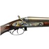 Cal. 12 Ga. 2 5/8". S# 15060. The 30" three stripe Damascus barrels are engraved "PARKER BROS. MAKERS MERIDEN CON. DAMASUS STEEL" on concave game rib. All correct marks are on barrel flats and watertable. There are no grade markings. Case hardened action with lightly sculpted fences has under lifter opening and is fitted with front spring, rebounding locks with early style firing pins. Action has radius to break off and reinforcing beads. Action and locks are engraved with geometric borders and have scroll flourishes in typical early grade 2 style. "PARKER BROS. is on each lockplate. S# is on blued trigger guard tang. Round knob pistol grip buttstock of lightly figured American walnut measures 14" over steel buttplate. Widely spaced point pattern checkering is at grip and a vacant German silver shield is at top of grip. Matching splinter forend has patent date on Parker type latch. MEASUREMENTS: BBLS: Bore Diameter: L .753. R .752. Restriction: L .032 (full). R .003 (IC). Wall thickness: L .036. R .034. STOCK: DAH: 2 7/8". DAC: 2". CAST: neutral. LOP: 14". WEIGHT: 8 lb. 5 oz. CONDITION: fine as attractively restored. Barrels with about 80% of a good quality re-brown, loss due to subsequent cleaning of rust spots on barrel in front of forend. There is still some red rust either side of top rib toward muzzles. Action retains essentially all of a vibrant recolor hardening, engraving is somewhat softened. Stocks retain nearly all of a reapplied dark oil finish. There are a few scattered light handling marks. Checkering re-cut. Bores are shiny, polished over considerable pitting, there is evidence of dent removal in right barrel 14" behind muzzle. Action is slightly loose, locks are good. Gun does match specifications in ledger. (01-22054/MGM). ANTIQUE. $1,000-1,500.