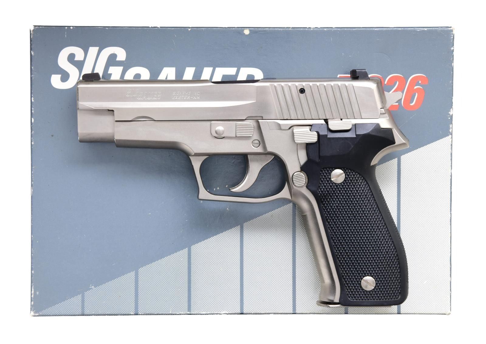 Cal. 9x19. S# U431227. Bbl. 4 1/2". Three dot Trijicon night nights. West German made Sig P226 w/ Exeter, NH import marking. Nickel finish. Checkered black grips. MAGS: 2-15 rd. nickel. UNATTACHED ACCESSORIES: matching numbered factory box w/ manual. CONDITION: all aspects are near excellent. PROVENANCE: the lifelong collection of Terrance McCarty. (24-174/MJC). MODERN. $500-700.