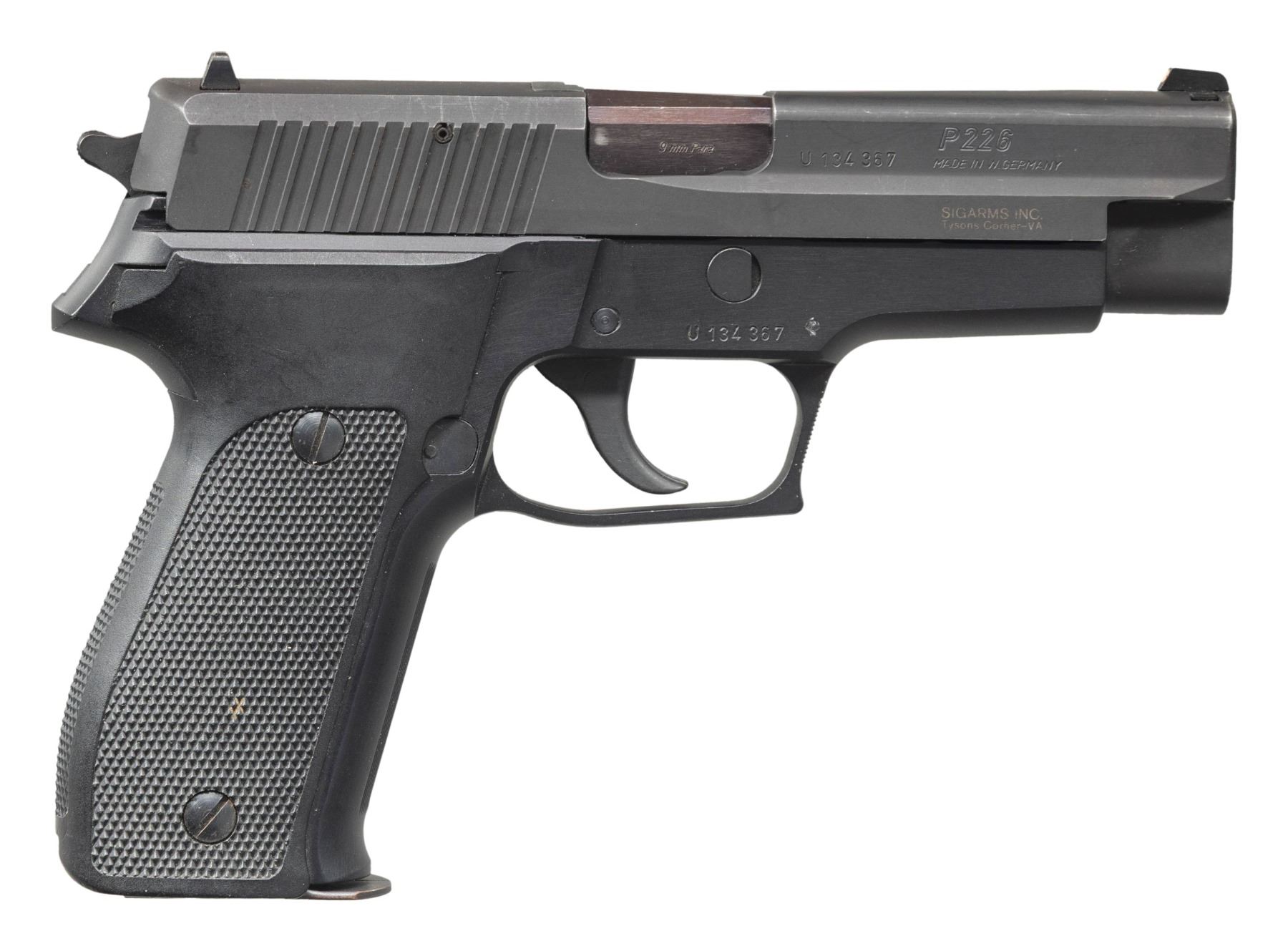 Cal. 9mm Luger. S# U134367. Bbl. 4 3/8". White dot front sight. Square notch rear sight with white stripe. Matching numbers on frame & slide. 1986 made West German P226 with Tyson's Corner import marking. Slide has a gray parkerized finish. Frame has a matte black finish. Checkered black grips. MAGS: 4-15 rd. Two mags are Sig Sauer marked & two marked only "P226" on floorplate. CONDITION: grips show light handling marks & scratches. Metal retains 95% original finishes with scattered edge wear, handling marks & light scratches. Action functions properly when hand cycled. Bright near excellent bore. (25-5248/MJC). MODERN. $700-1,000.