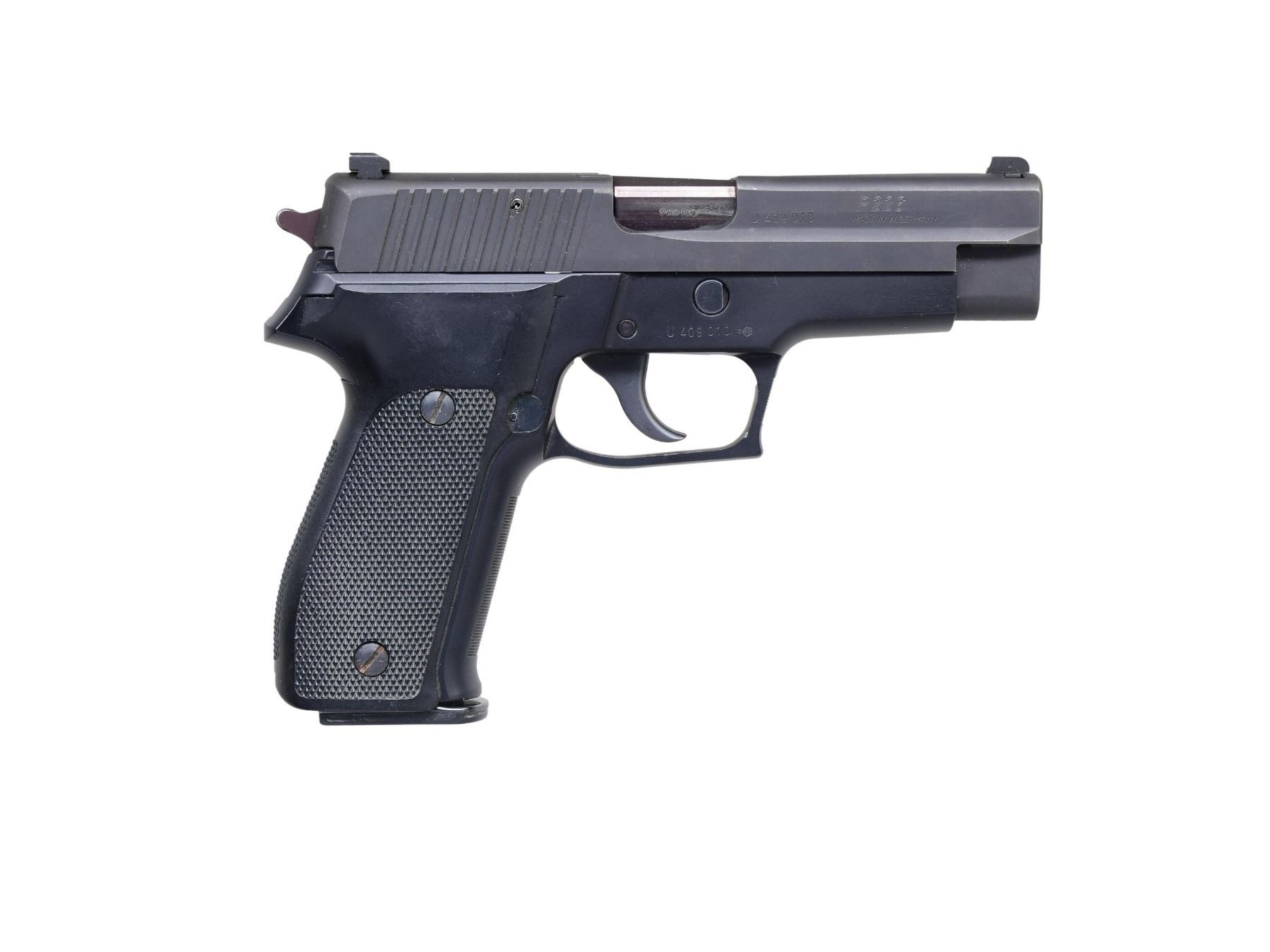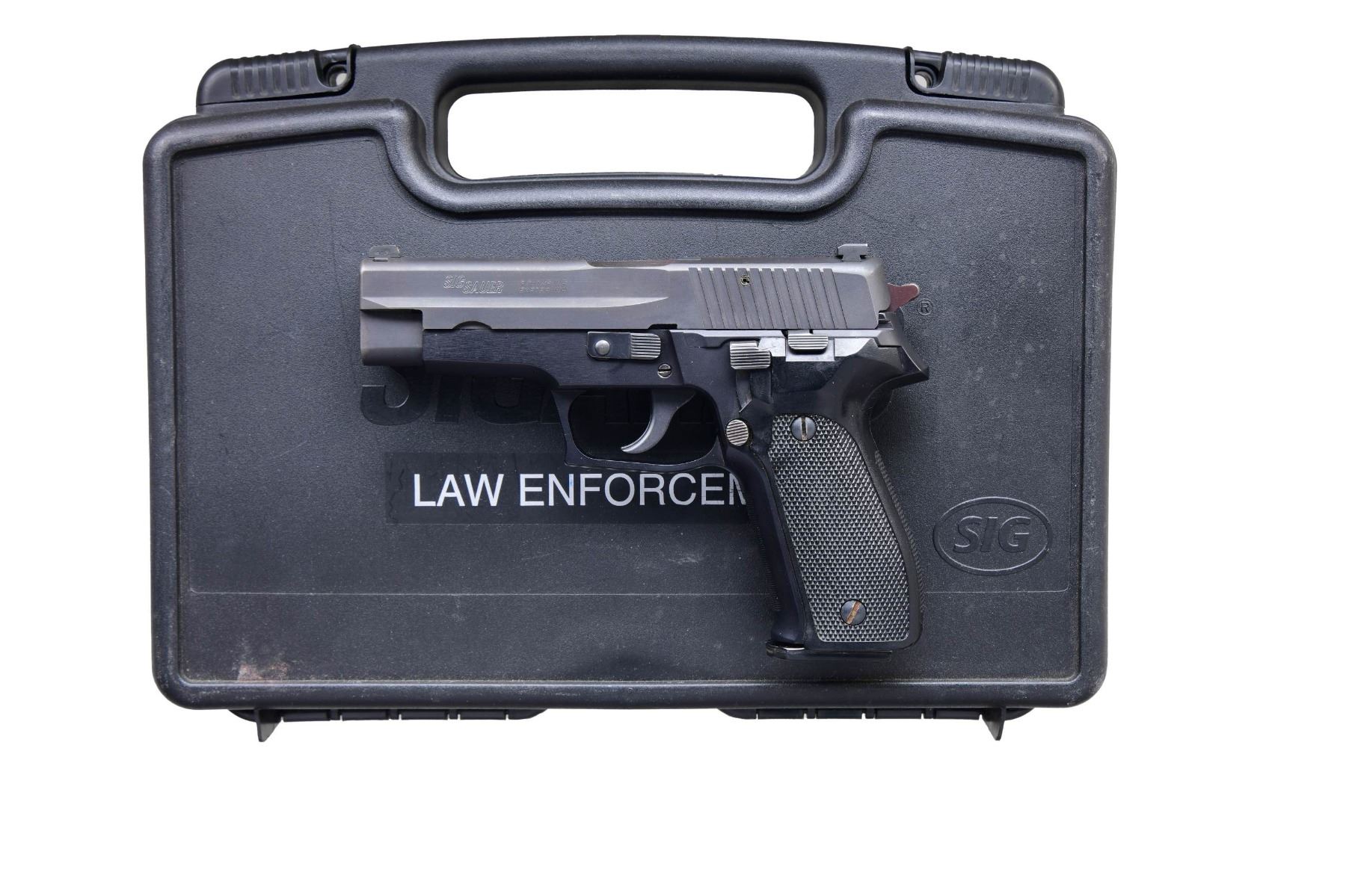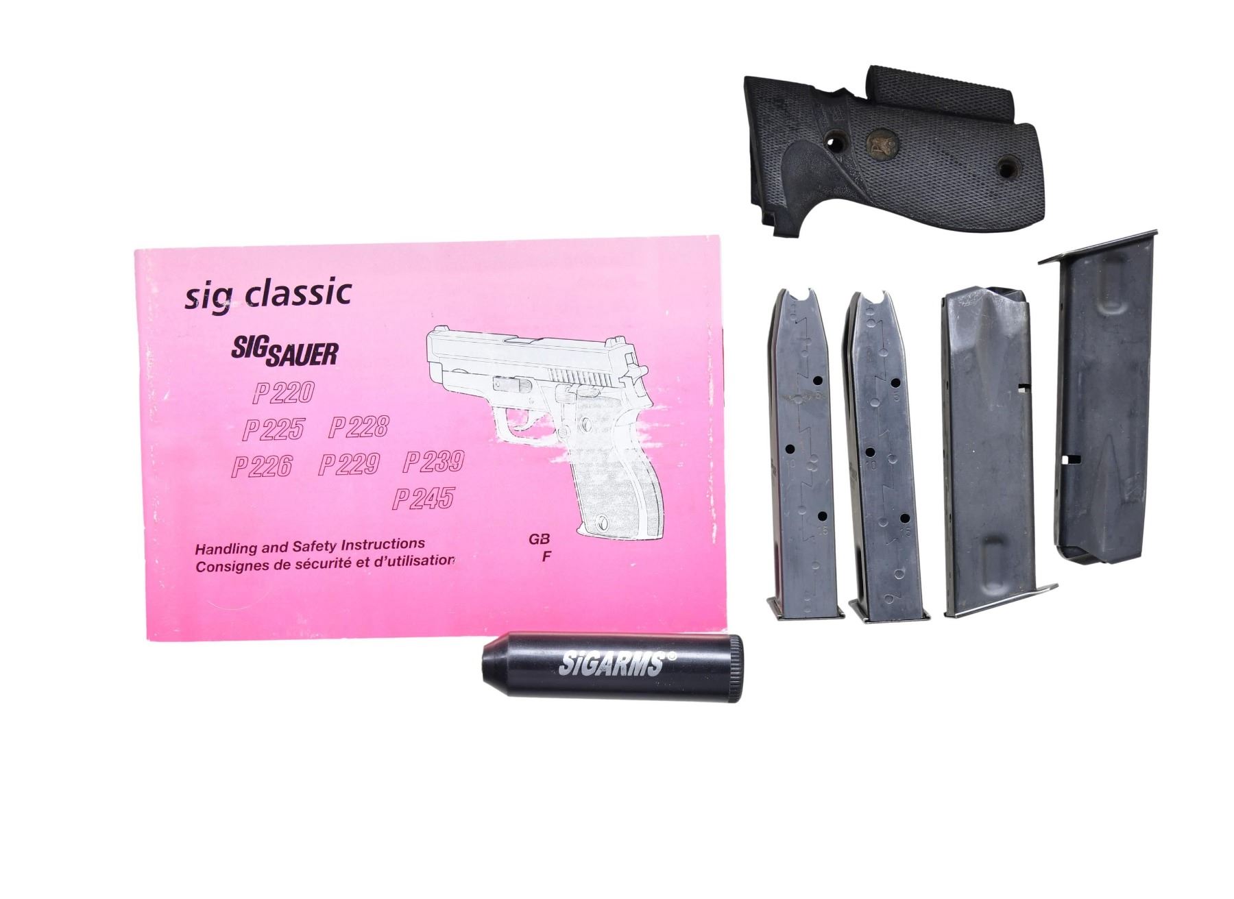 Cal. 9mm Luger. S# U 409 010. Bbl. 4.4". Desirable, early model made in West Germany with matte black finish and appropriate proofs. Matching numbers on frame, barrel and slide with factory night sights (dead). Factory checkered black plastic grips. MAGS: 5 TOTAL; all factory 15 rd. with thicker base on one. UNATTACHED ACCESSORIES: "Law Enforcement" marked black plastic carry case, Sig cleaning kit (appears new), manual and Pachmayr Signature grips. CONDITION: light function wear on barrel and guide rod; balance is near excellent including bore. (24-2157/NW). MODERN. $650-900.