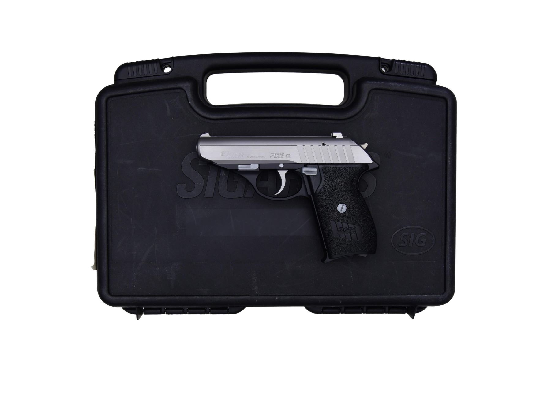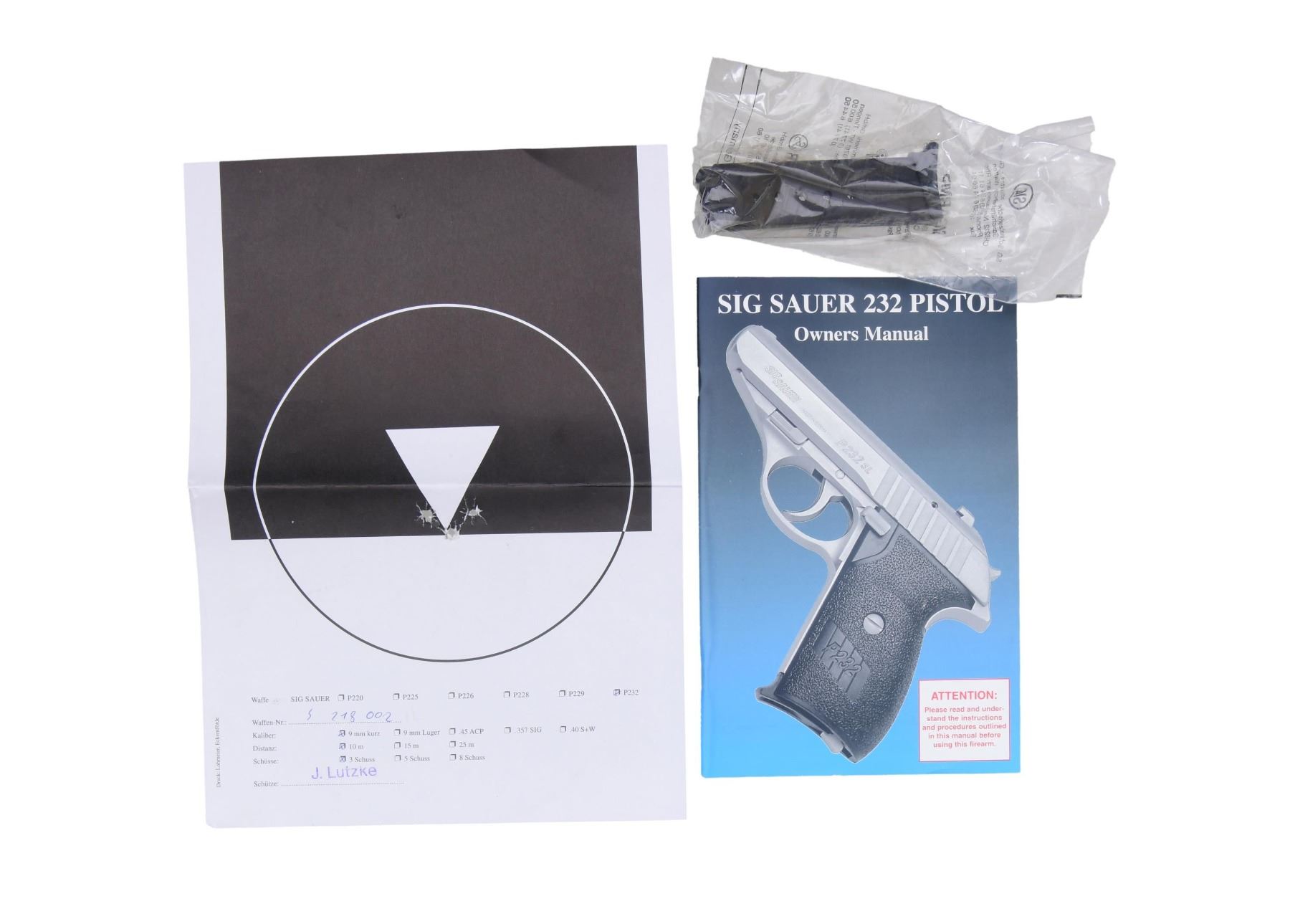 WITH MATCHING BOX. Cal. 9mm Kurz (380 ACP). S# S218002 (KJ = 1998 Bbl. 3.6". This Sig Sauer P232 features a stainless steel finish. The front sight is a fixed blade and the rear sight is a fixed notch. The frame configuration includes a manual decocker lever on the left side and a magazine release at the heel of the frame. The grips are black polymer. MAGS: two 7 rds. UNATTACHED ACCESSORIES: original factory box, manual, and test target. CONDITION: overall condition is near excellent, with approx. 98% of the original finish remaining on the slide and frame. The bore is bright and sharp. PROVENANCE: from the lifelong collection of Terrence McCarty. (24-255/MD). MODERN. $400-$600.