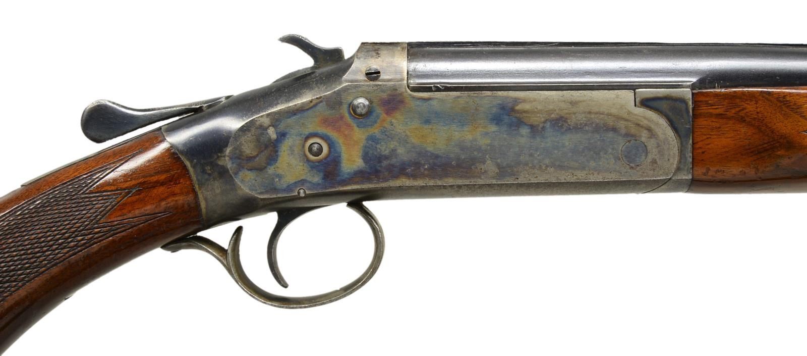 Cal. 410, 2 1/2". S# 43170 D. Bbl. 26" w/ solid rib, brass bead & fixed Full choke. Case colored top lever exposed hammer action. Left side is marked "Western Field". Schnabel tipped walnut forearm & hard rubber capped pistol grip stock w/ hand checkering. LOP: 14" over original buttplate. Mfg. by Iver Johnson 1912-1941. CONDITION: 80% lightly faded bbl. blue showing handling marks & spots of light pitting. Forward portion of rib shows evidence of being resoldered. Action retains 80% lightly faded case colors. Original wood finish shows wear spots, finish chips, handling marks & sm. dents. Stock has sm. chips & cracks around action & top tang. Very good bright bore. (21-3572/DS). CURIO. $400-600.