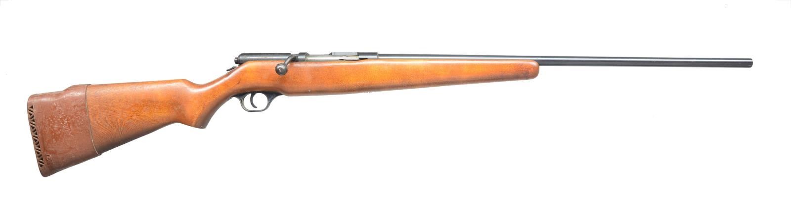 1) WESTERN FIELD M150D BOLT ACTION. Cal. 410, 3". S# 118235. Bbl. 24" plain w/ fixed Full choke. Bolt action w/ 2 shot blind box mag. having safety lever behind receiver. Monte Carlo hardwood stock w/ plastic trigger guard. LOP: 14 3/8" over Westernfield slip on rubber pad. Mfg. by Mossberg. CONDITION: 90% blue showing spots of corrosion. Stock has worn finish showing handling marks & mildew spots. Bore shows areas of fouling. Front bead is missing. (21-3390/DS).