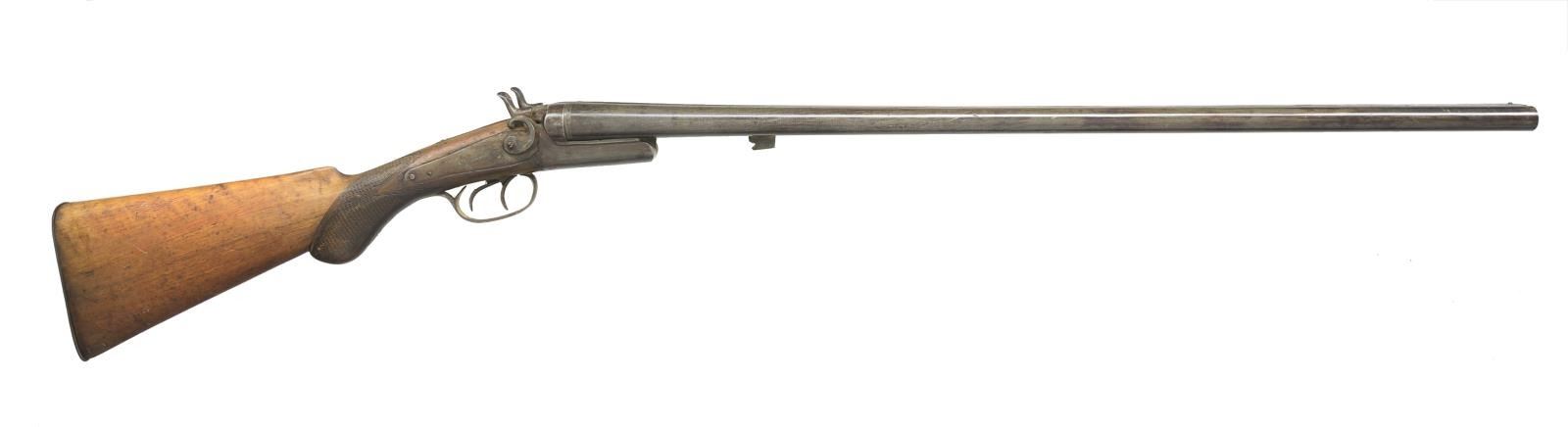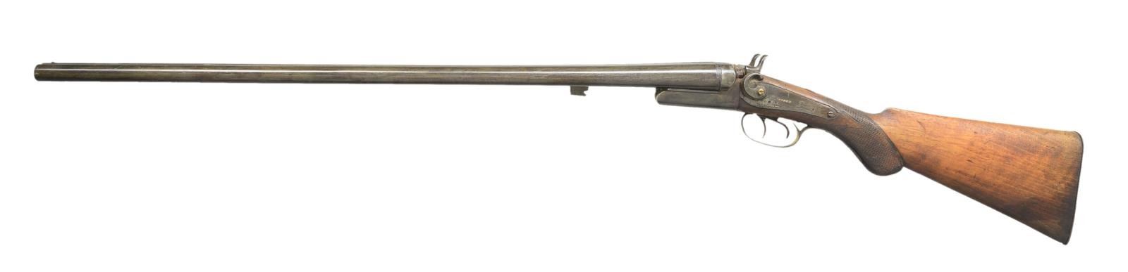 2) T BARKER SXS HAMMER. Cal. 12 Ga. NSN. Bbls. 30" of Laminated Steel w/ fixed Mod. & Full choke. Rnd. body receiver w/ back action locks marked "T BARKER". Dbl. triggers. Extractors. Rnd. knob walnut stock w/ steel buttplate & checkered wrist. CONDITION: top lever is broken off not allowing gun to open. Forearm wood & iron are missing. Buttplate & hammer screws are replacements. Metal has gray coloration from cold blue. Sanded stock is undersized at buttplate showing heavy wear & handling marks. Pitted bores. (21-3393/DS). BOTH CURIO. $175-250.