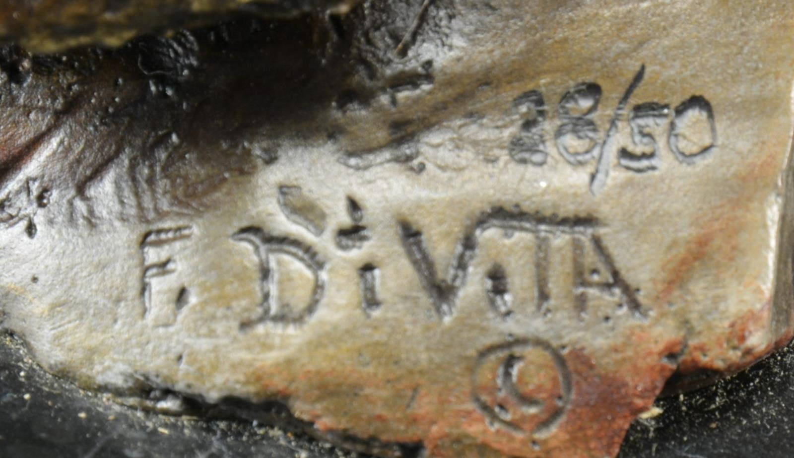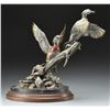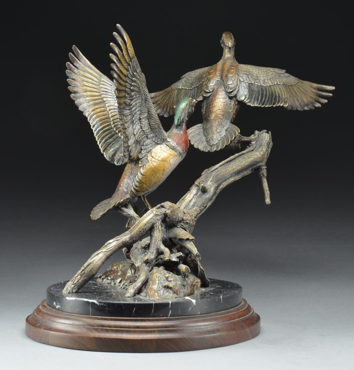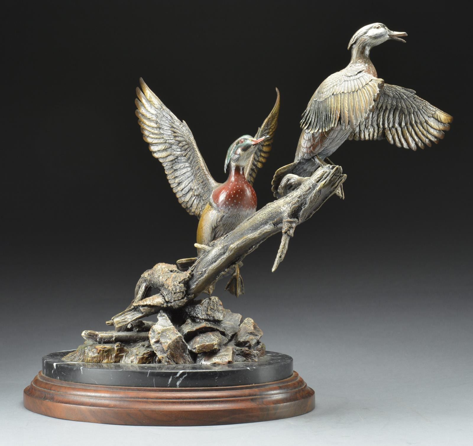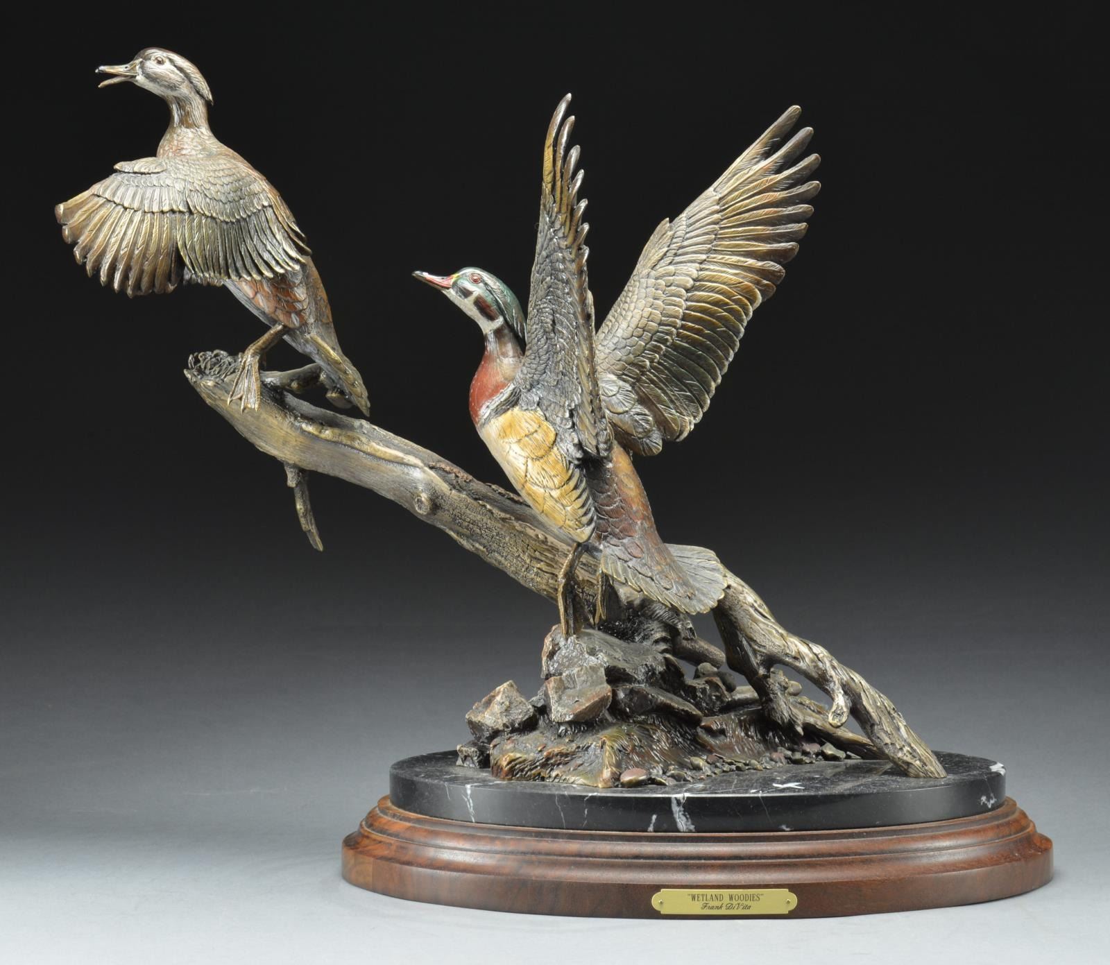 Statue has brass plate on base "WETLAND WOODIES" Frank DiVita. Bottom of statue is also marked "F. DiVita Issue 38 of 50". Hand colored representation of a wood duck male & female taking flight from piece of driftwood. Mounted on wood & marble base. Statue & base are approx. 24" long X 13" wide X 19" tall. CONDITION: marble base has slightly dusty appearance & notable 3" crack on right side above title plate. 3 other cracks in marble throughout. (02-15855 /RW). $400-600.