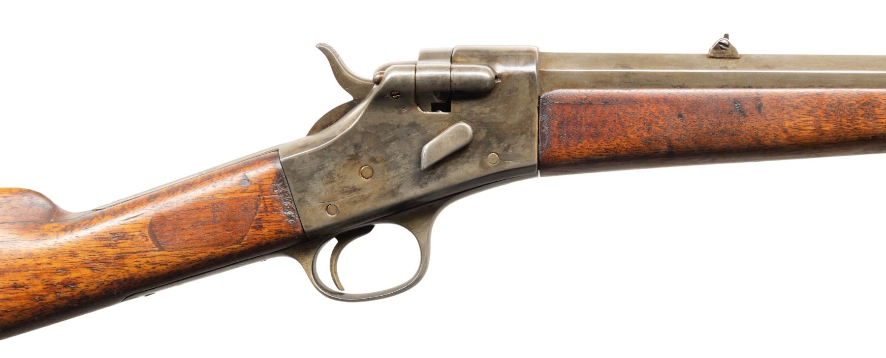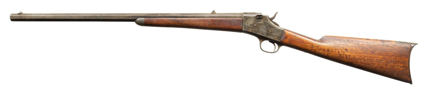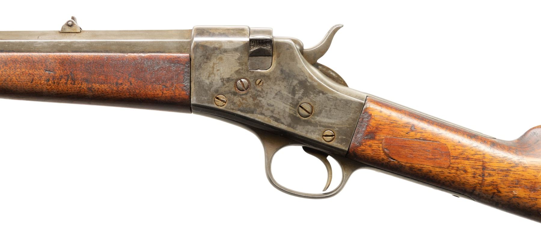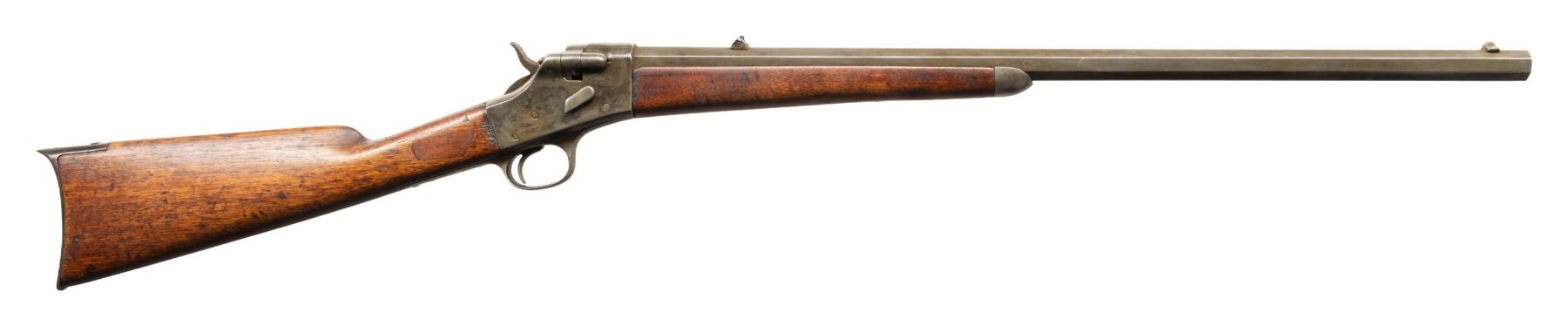 RIFLE. Cal. 44 (44 CF or 44-40). S# 1975. Mfg. 1867-1881. Matching numbers on oct. 26" bbl., swivel breech, & walnut forearm. German silver blade front sight & folding rear sight. Walnut stock set w/ steel crescent buttplate & forearm tip. CONDITION: metal has a cleaned gray appearance of previous touch up blue applied along with scattered marks & scratches. Sanded & refinished wood has spliced wood repairs to wrist along with numerous dings & cracks. Worn bore with pitting. PROVENANCE: Estate of Groves Herrick. (01-28894/MD). ANTIQUE. $500-900.