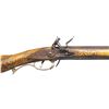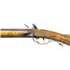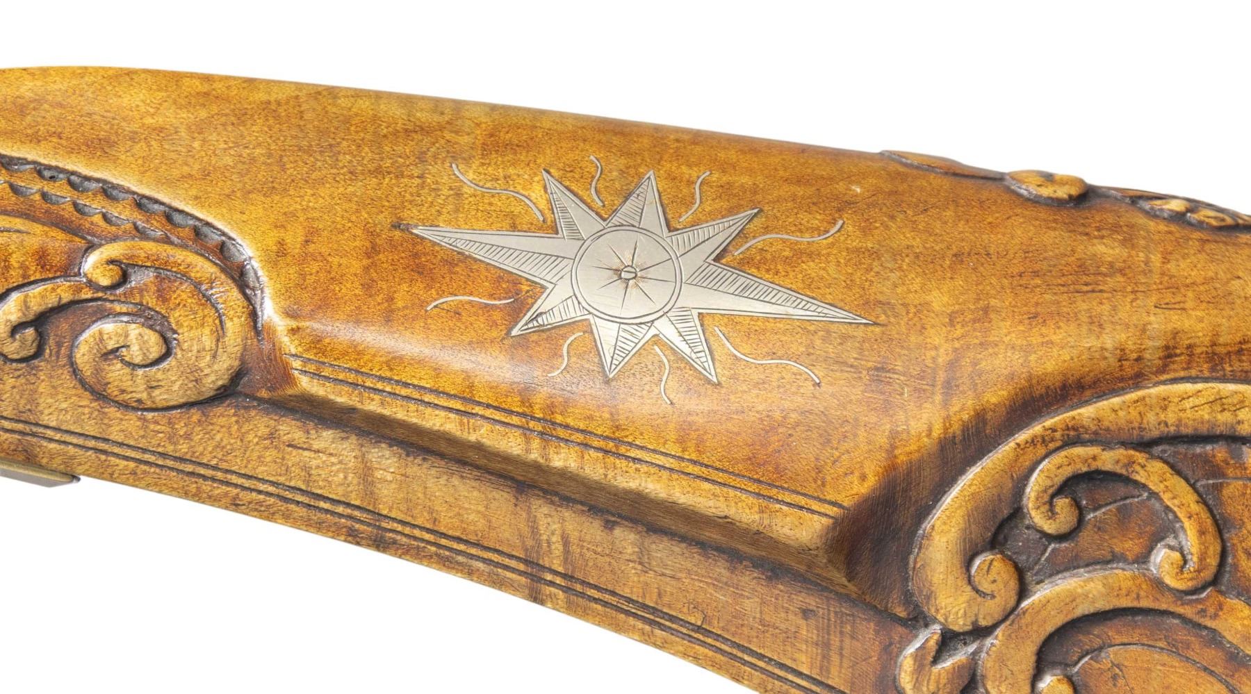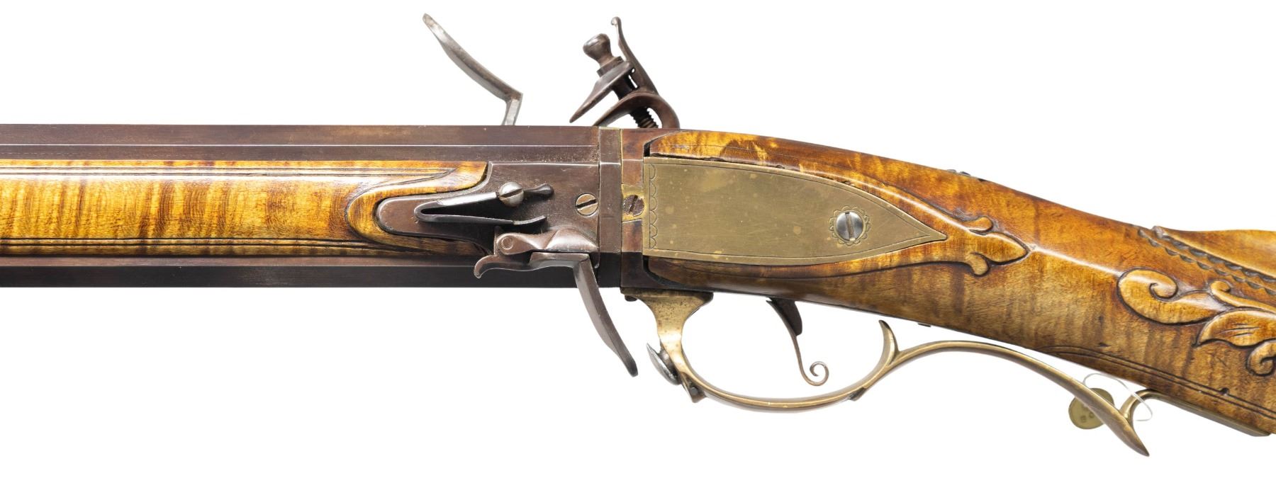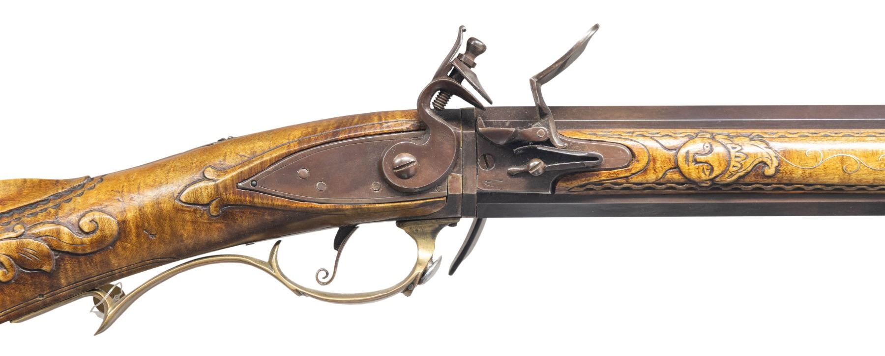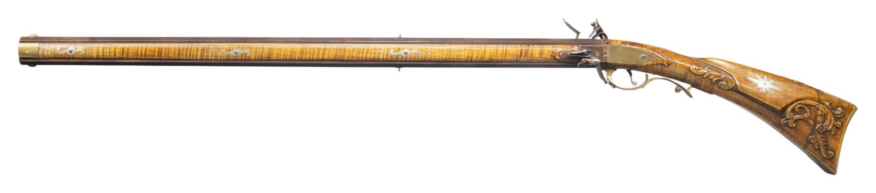 FLINTLOCK RIFLE. Cal. 45. NSN. William Buchele 1895-1977 was a renowned builder of contemporary flintlock & percussion rifles & pistols in the 1960's -1970's. He is known as a co-author of the book "Recreating the American Long Rifle" with George Shumway and Peter Alexander. Bbls. 32 1/2" octagon measuring 3/4" across the flats. Top flats are marked "W. Buchele". German silver blade front sights with fixed U notch rear sights. Breech ends have unmarked pan & frizzen plates with german silver top flat plates stamped 1 & 2. Unmarked iron lock is border line engraved. Curled plain trigger. Roman nose cheek piece stock of fine curly maple has extensive relief carving in the cheekpiece, comb & wrist areas with additional relief carved points behind the lock & sideplate. Right side has a rectangular lid brass patch box with floral finial having light coverage of floral & line engraving. Additional brass stock fitting consist of the crescent buttplate, toeplate, trigger guard & sideplate. The cheekpiece has an engraved 8 point German silver star highlighted by wire inlay simulating rays of sun. The bbl. section has full length brass tipped curly maple side panels. Right panel features a relief carved native American woman highlighted by curled wire inlay and chain carved borders. Forward portion has a faceted brass thimble and 2 faceted brass pipes holding the brass brass tipped hardwood ramrod between moldered borders. Left panel has incise carved double line borders with German silver pipe & thimble escutcheons highlighted by curled wire inlay. Weight 8 lbs. 14.4 oz. CONDITION. near excellent. Finely browned metal shows light carry & edge wear. Stocks have very good finish showing a few small marks. Sound action. Very good bores. (01-27920/DS). ANTIQUE. $3,500-5,500.