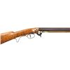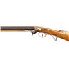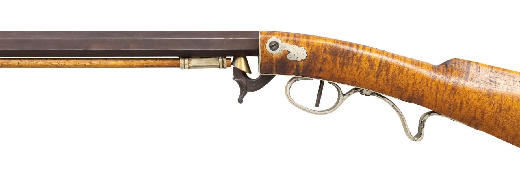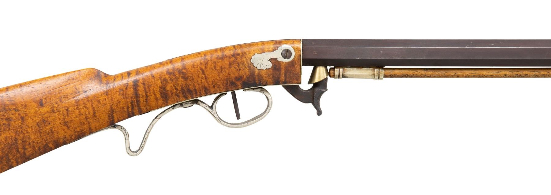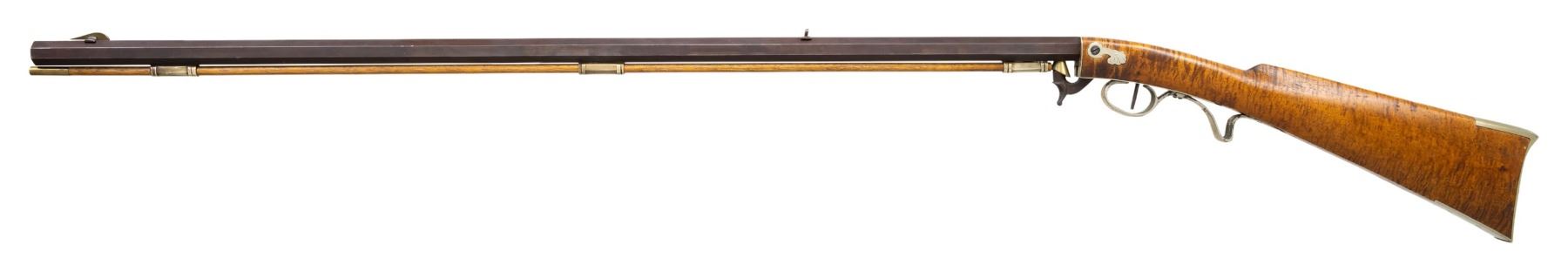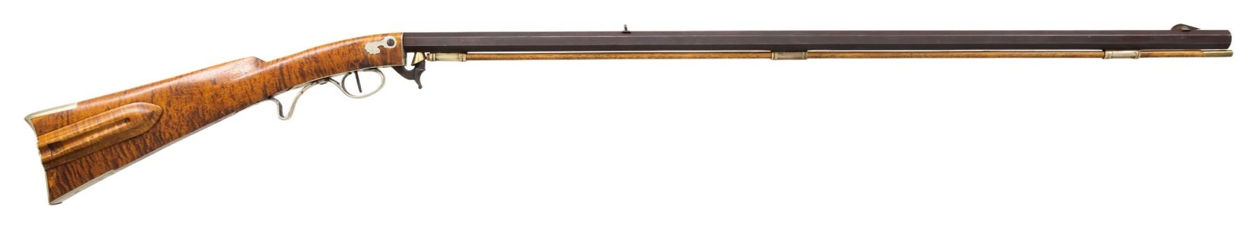 PERCUSSION RIFLE. Cal. 45. NSN. Bbl. William Buchele, 1895-1977, was a renowned builder of contemporary flintlock & percussion rifles & pistols in the 1960's-1970's. He is known as a co-author of the book "Recreating the American Long Rifle" with George Shumway and Peter Alexander. 33 3/4" octagon bbl. measures 3/4" across the flats. Top flat is engraved "Buchele". Brass blade front with fixed V notch rear sight. Under hammer action & plain trigger have a brass nipple shield. Maple butt stock of curly maple has a sliding fluted maple patch box cover. Nickel finished finger curl trigger guard. Crescent buttplate, toe plate, trigger plate stock escutcheons and 3 faceted pipes are German silver. Brass tipped hardwood ramrod. CONDITION: fine, retaining most original finish. Sound action. Bright near excellent bore. (01-27935/DS). ANTIQUE. $800-1,400.