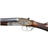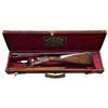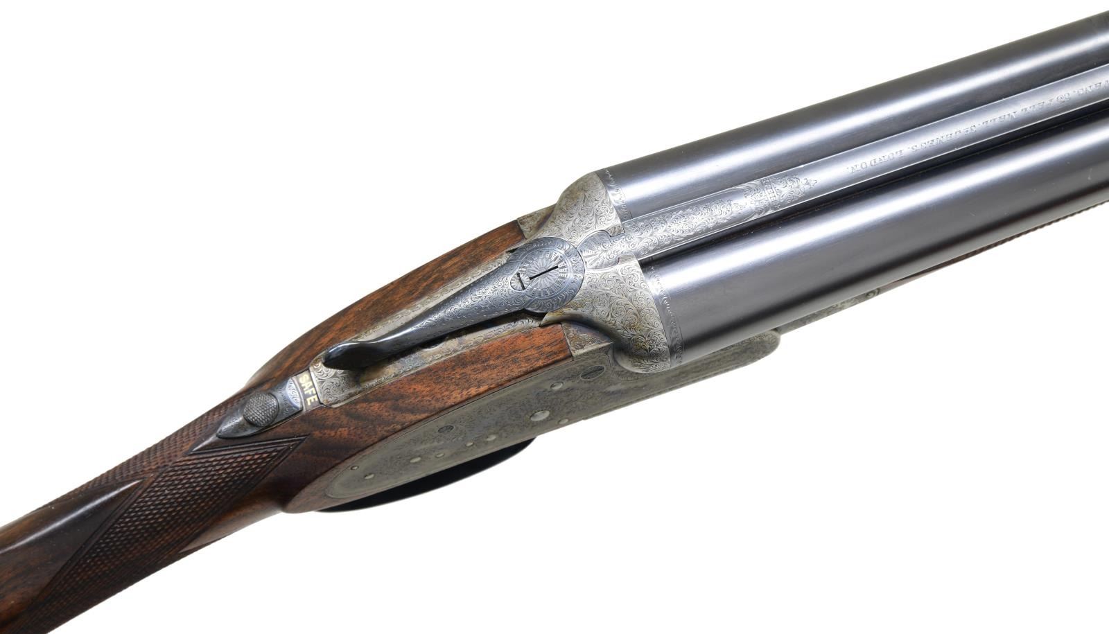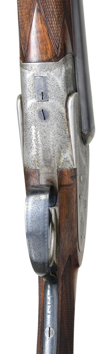 Cal. 16 ga. 2 1/2". S# 12187. Bbls. 28" w/ sunken concave rib & steel bead. Nitro proofs for 1 oz of shot. Case colored sidelock action. Full coverage arabesque scroll hand engraving. Double triggers, ejectors, splinter forearm & straight hand stock of fancy English walnut. LOP: 14 1/2" over leather covered pad. DAC: 1 3/8". DAH: 2 5/8". Stock has approx. 1/8" cast off. Bore diameter: R .665 L .663. Choke constriction: R .019 L .035. Minimum wall thickness: R .032 L .032. WEIGHT: 6 lbs, 2.6 oz. UNATTACHED ACCESSORIES: leather covered case w/ burgundy felt fitted interior having maker's label. Case contains 2 piece cleaning rod, 1 snap cap, oil bottle & cleaning accessories. Case lid is marked "G.H.W. Jr.". Consignor states that he believes this is George Herbert Walker Jr., although we have no documentation to support this. Case shows interior & exterior wear. CONDITION: bbls. retain 98% reblacked finish. Action retains 50% case colors showing wear & silvering in carry areas. Reblued trigger guard. Wood has very good refinish w/ recut checkering. Top lever sits slightly left of center. Very good bright bores. (24-2189/DS). CURIO. $8,500-10,500.