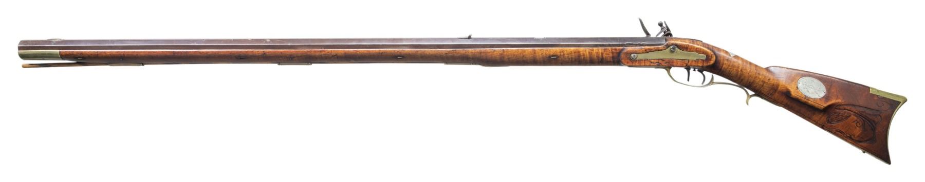 Cal. 58. NSN. Bbl. 40" octagon measuring 1 1/8" across flats at the muzzle. Dovetail mounted German silver blade front sight with fixed V-notch rear sight in a second added dovetail 12 1/4" forward of the breech. A second open dovetail is found 7 1/2" from the breech. Top flat is marked "W. Hawken". William Hawken, 1798-1885, of Williamsport, MD. was the 5th son of Christian Hawken. He built more traditional long rifles that contrasted with the half stock St. Louis rifles built by his famous brothers Jacob and Samuel. The lightly engraved trade lock is marked "LONDON / WARRANTED." Double set triggers. Full length curly maple stock is held by 4 brass wedges. Brass fittings include a nose cap, sideplate, crescent buttplate, toe plate & finger curl trigger guard. Pierced & segmented rectangular lid patch box is lightly engraved. German silver ornamentation consist of a diamond wrist plate with an American Eagle & shield engraved on the oval cheekpiece inlay. The cheek piece & toe line have moulded lower edges with highlights of relief carving found between the cheekpiece & buttplate. Artificially striped hardwood ramrod held by a brass thimble and 2 octagon pipes. UNATTACHED ACCESSORIES: previous auction listing stating that this rifle was formerly of the Bill Reisner (former president of the KRA) Collection. CONDITION: metal finish has largely faded to a mottled brown showing scratches, marks, and small dents with pitting becoming heavy in the breech area. Lock is not cocking properly, triggers are not setting properly. Brass and German silver fittings have a mildly cleaned appearance. Stock is broken through the wrist area with added wood repairs around the lock and shows scattered scratches, dents, and marks. Dark lightly pitted bore retaining strong rifling. PROVENANCE: The Esteemed Norm Greenberg Collection. (01-27745/DS). ANTIQUE. $4,000-6,000.