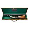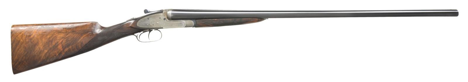 GAME GUN WITH CASE. Cal. 12 Ga., 2 1/2". S# 10917. 30" Dovetailed bbls. are engraved "W. Kavanagh & Sons" on game rib with short extension. Bbl. flats are stamped with Birmingham Nitro proofs for 2 1/2" chambers. Coin finished square back action is fitted with backspring sidelocks and features automatic safety, pivoting third fastener engaging rib extension and double triggers. Action and locks are engraved with 80% coverage well cut shaded scroll within small scroll borders. Maker's name is on each lockplate. Top lever pivot is relief engraved "KAVANAGH DUBLIN". Good quality newly made straight grip buttstock  of very fine lightly streaked and well figured European walnut has slight swan neck and measures 14 3/8" over checkered wood butt. Point pattern checkering is at grip. Matching splinter Baker ejector forend has Anson release. MEASUREMENTS: BBLS: Bore Diameter: R .739", L .731". Restriction: R .003", L .037" (FULL). Min. Wall Thickness: R .022", L .022". STOCK: DAH: 1 7/8". DAC: 1 7/16". LOP: 14 3/8". CAST: approx. 1/2" off. WEIGHT: 6 lb. 14 oz. UNATTACHED ACCESSORIES: gun is housed in green canvas leather trimmed case with blue canvas dark leather trimmed outer cover with snap closure. Top of lid is printed "J. MC. D. Haskard" "R. D. FUS.". Interior is lined in green felt and has reproduction Cavanagh label in lid. Case contains two piece cleaning rod with mop and brush, large A&N CSL oil bottle and a pair of Cogswell & Harrison snap caps. CONDITION: good as refurbished. Bbls. retaining about 90% of an old reblack with some silvering most evident along sides of rib. Action cleaned to coin finish with subsequent darkening. Top lever and trigger guard reblued. Engraving considerably washed. New stocks retain most of their spotty oil finish. Checkering with light wear. Bores are bright and shiny. Forcing cones have been lengthened. Action is tight.  Bbls. slightly off face. Ejectors are in time. Case has many stains, rubs and soiling on exterior. Leather trim is good. Straps and handle are good. Outer cover is relatively new. Interior cloth is good with some rubs and stains and blue from block removal. Accessories are generally good. (22-4542/MGM). CURIO. $2,000-4,000.
