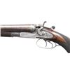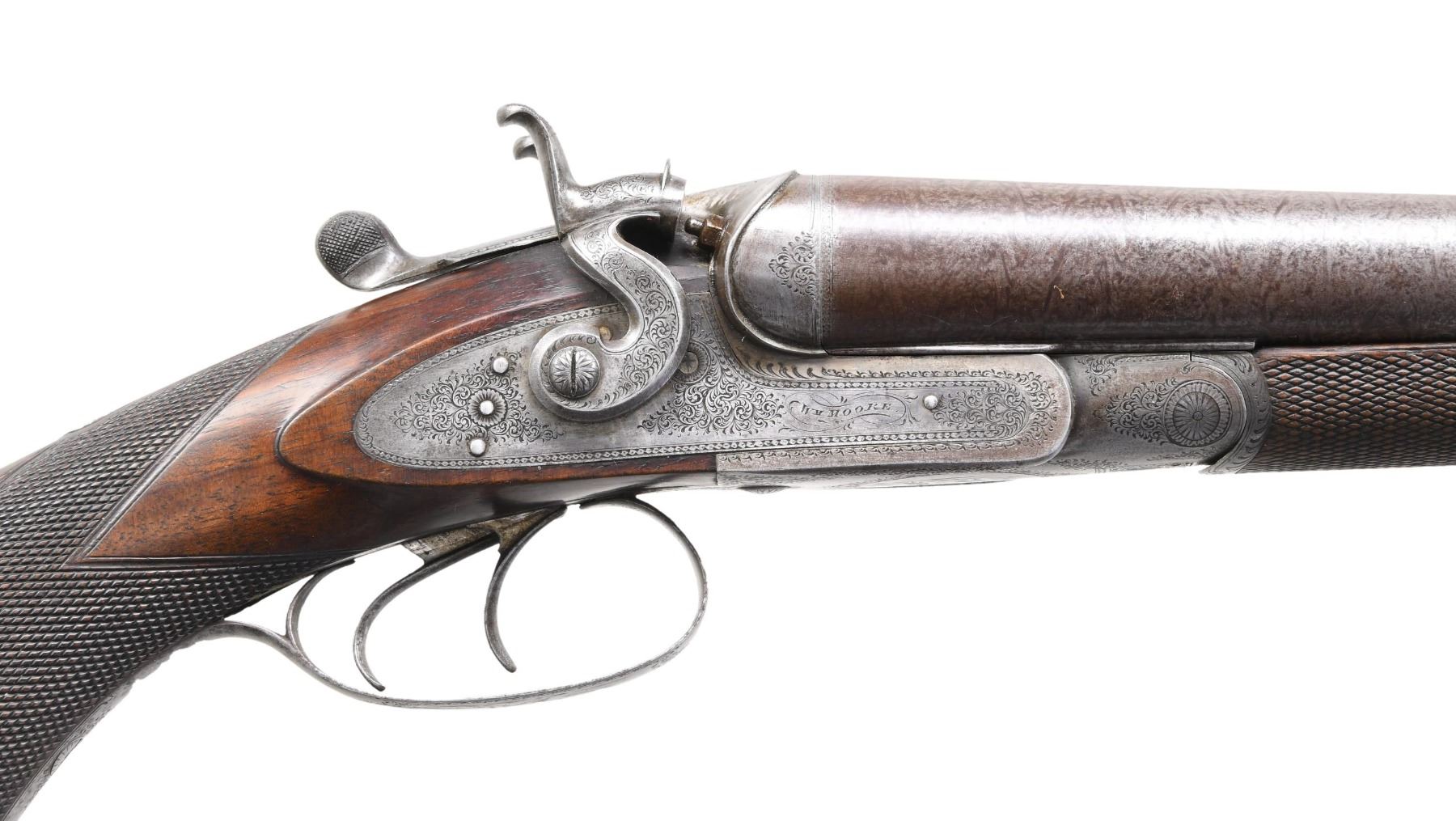 SHOTGUN. Cal. 10 ga 2 3/4". S# 8141. Bbls. 29 7/8" of twist steel. Sidelock top lever action w/ pronounced fences & rebounding hammers. Generous coverage of arabesque scroll engraving & fancy borders featuring 2 red grouse on the floorplate & a pointing dog on the trigger guard bow. Double triggers. Extractors. Ebony tipped schnable forearm & steel capped pistol grip stock w/ hand checkering having German silver nameplate in toeline. LOP: 14 1/8" to engraved steel shotgun buttplate. DAC: 2 3/16". DAH: 3 1/4". Neutral cast. WEIGHT: 10 lbs, 1.4 oz. Choke constriction: R .011 L .006. CONDITION: metal finish has faded to a smooth gray showing good twist pattern on bbls. Wood shows worn finish & checkering w/ scattered scratches & marks. Forearm is missing long chips along the bbl. channels. Action is tight & on face. Bores show scattered spots of very light pitting. PROVENANCE: From the Collection of a Tennessee Gentleman. (01-25634/DS). ANTIQUE. $800-1,600.