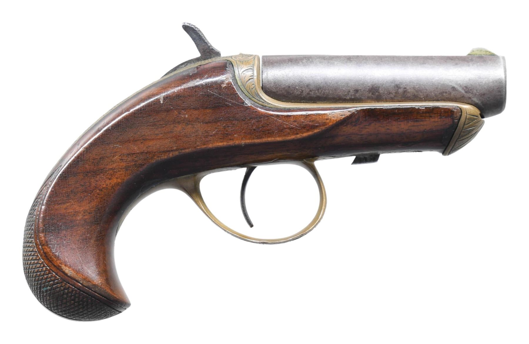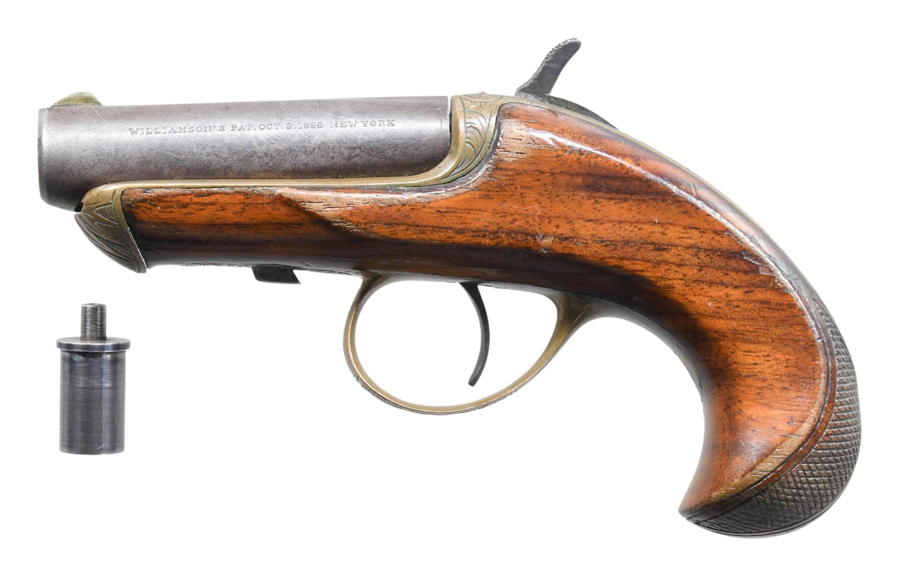 Cal. 41 RF with auxiliary percussion chamber adapter. S# 7957. Bbl. 2 1/2" rnd. with arrow engraved on top flat. Brass blade front sight. Engraved brass frame trigger guard and nose cap. Bbl. slides forward on frame for loading. Birds head walnut stock with hand checkering at butt. Mfg. 1866-1870. UNATTACHED ACCESSORIES: removable percussion adapter. CONDITION: bbl. finish has faded to brown. Brass frame and fittings show a pleasing patina. Original wood finish shows wear spots and handling marks. Sound mechanics. Dark moderately pitted bore retaining discernible rifling. (01-26648/DS). ANTIQUE. $700-1,000.