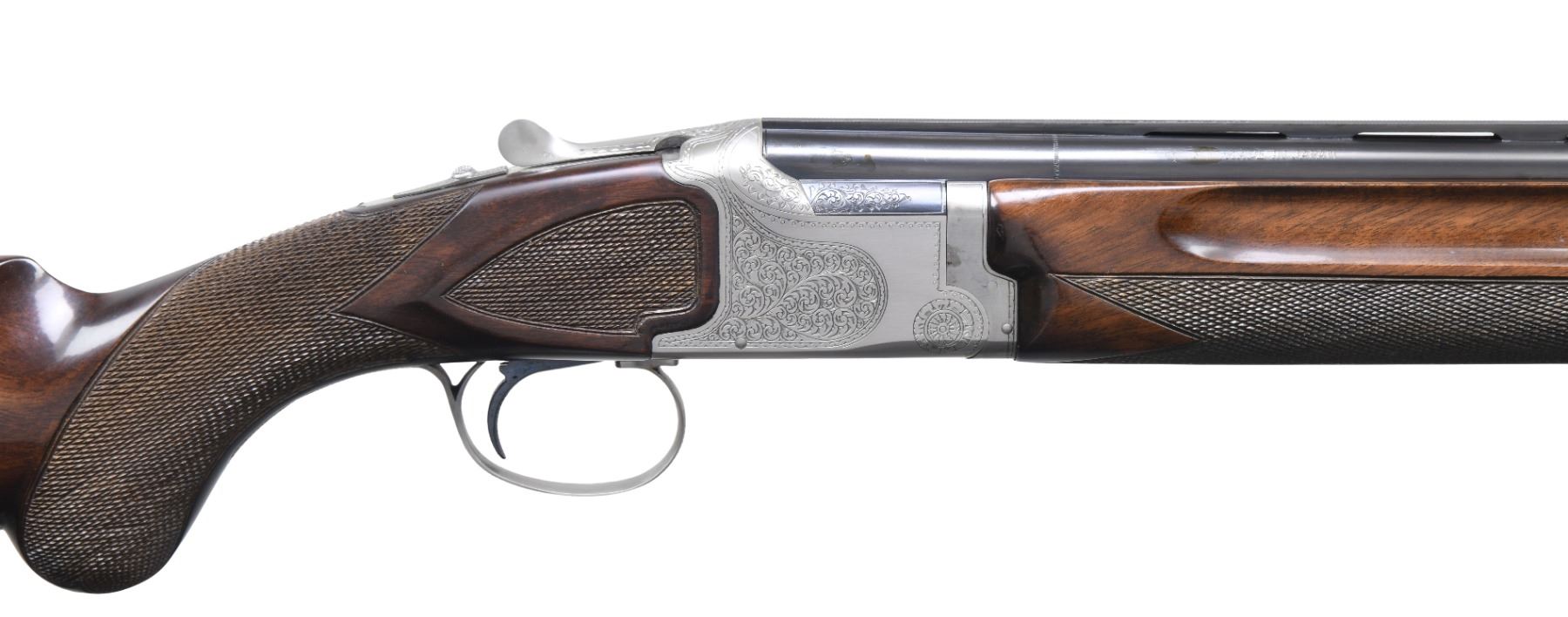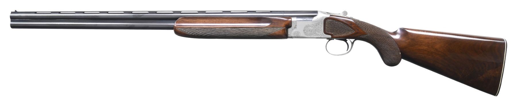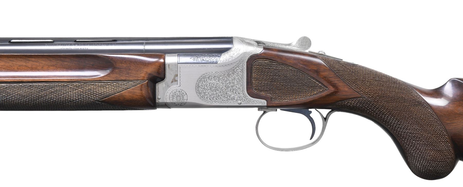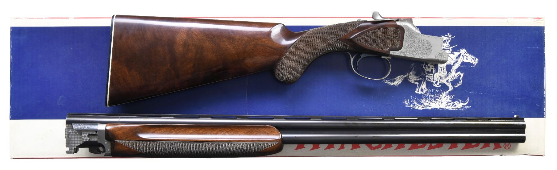 Cal. 20 ga. 2 3/4". S# PK260559. Bbls. 26" vent rib w/ white target front & white mid bead. Fixed Imp Cyl. & Mod chokes. Satin silver finished boxlock action w/ scroll ornamentation having pigeon on the floorplate. Checkered SST. Ejectors. Forearm & round knob stock of gloss finished walnut w/ hand checkering. LOP: 14" over original buttplate & white line spacer. DAC: 1 3/8". DAH: 2 3/8". Neutral cast. WEIGHT: 6 lbs, 6.6 oz. UNATTACHED ACCESSORIES: original red, white & blue box containing instructions, hang-tag, purchase card & hunter's pocket guide. CONDITION: near new, retaining virtually all wood & metal finish. Action & breech end of bbls. have spots of hardened grease from years of storage. Action is sluggish due to hardened grease. Bright near excellent bores. (25-772/DS). MODERN. $1,750-2,750.