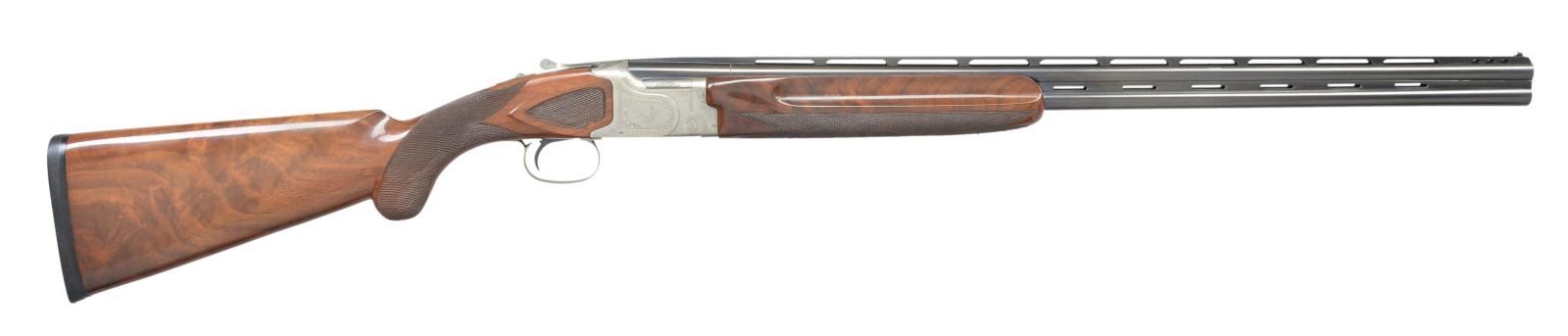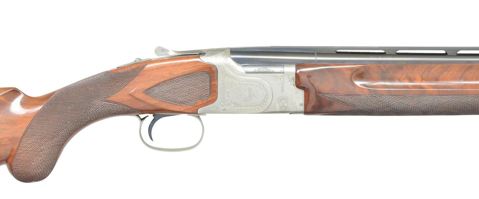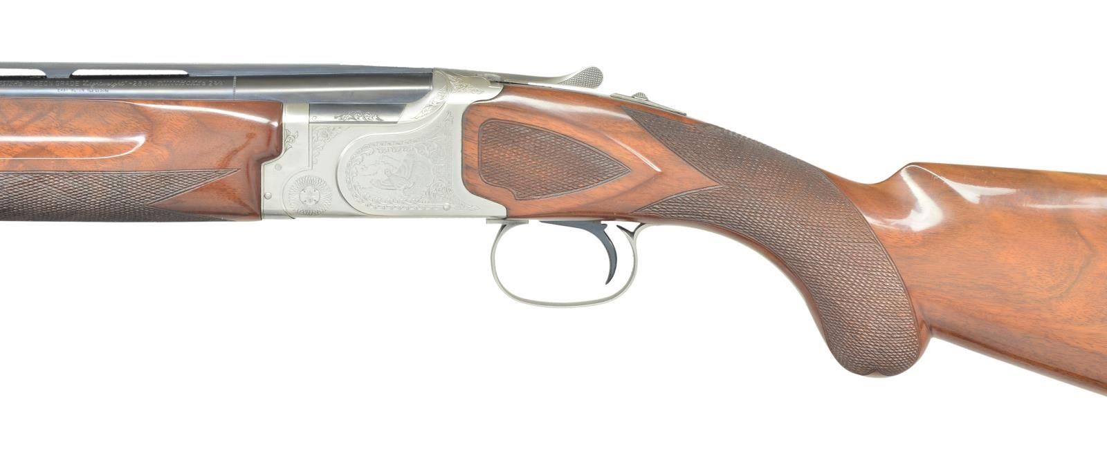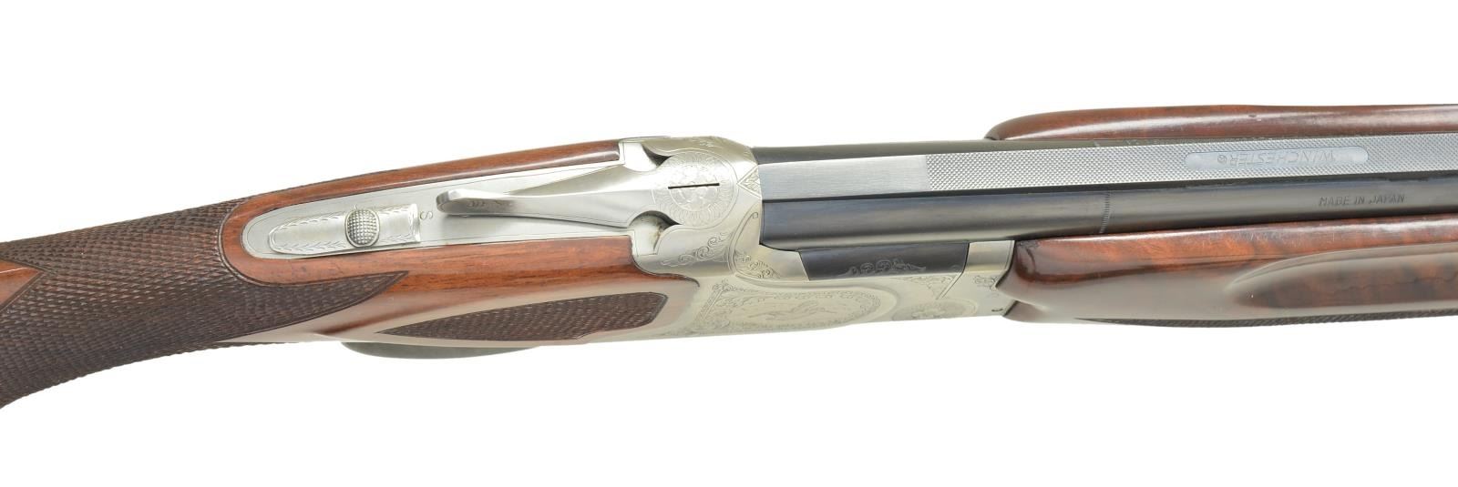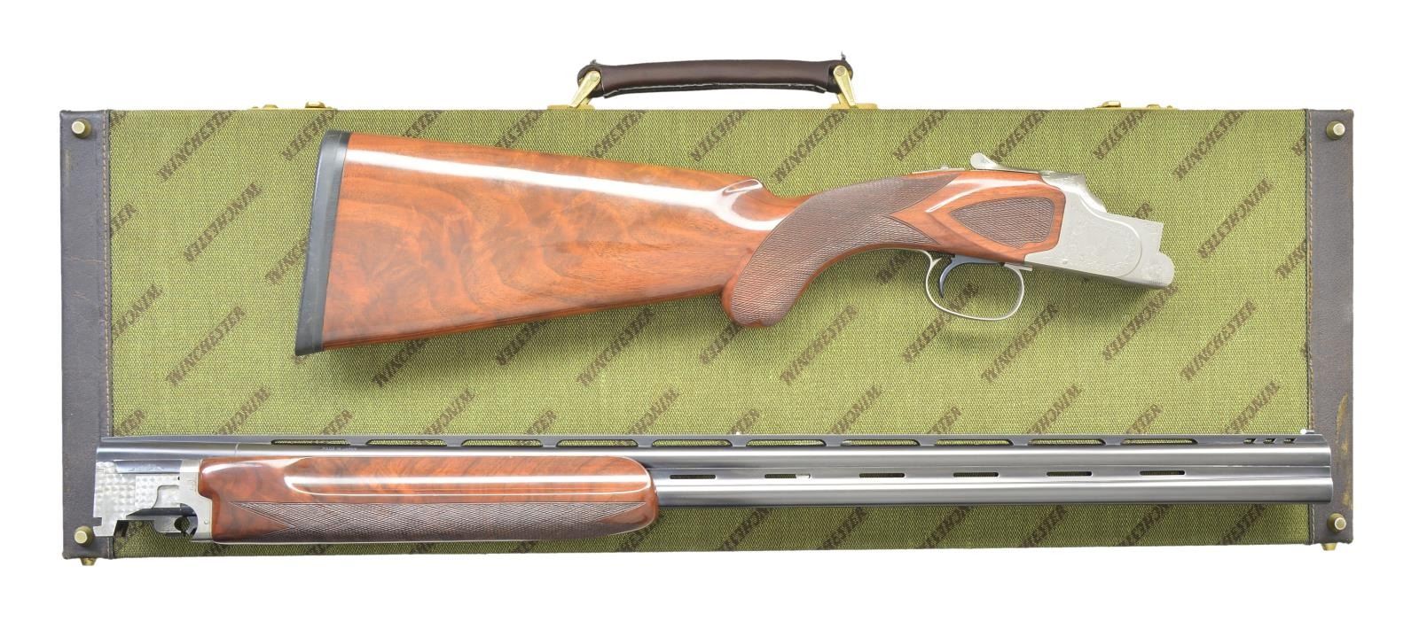 SHOTGUN. Cal. 28 Ga 2 3/4”. S# PK283630E. Bbl. 27” vent rib w/ ventilated side ribs. White target front side w/ white mid bead. Winchoke interchangeable chokes. M&F tubes included. Baby frame boxlock silver colored action. Right side has vignette of woodcock. Left side has a grouse. Scenes are surrounded by foliate scroll that extends to upper & lower receiver areas as well as iron. SST. Selective ejectors. Finger groove forearm & round knob pistol grip stock of gloss finished walnut w/ cut checkering that extends to the stock ears. LOP: 14” over original thin black pad. WEIGHT: 6 lbs, 3 ozs. Discontinued in 1987. UNATTACHED ACCESSORIES: green canvas covered makers case w/ red cloth fitted interior. Case contains keys. CONDITION: near excellent retaining over 98% finish. Bright near excellent bores. (22-5950/DS). MODERN. $3,000-4,000.
