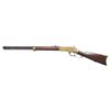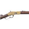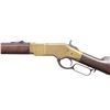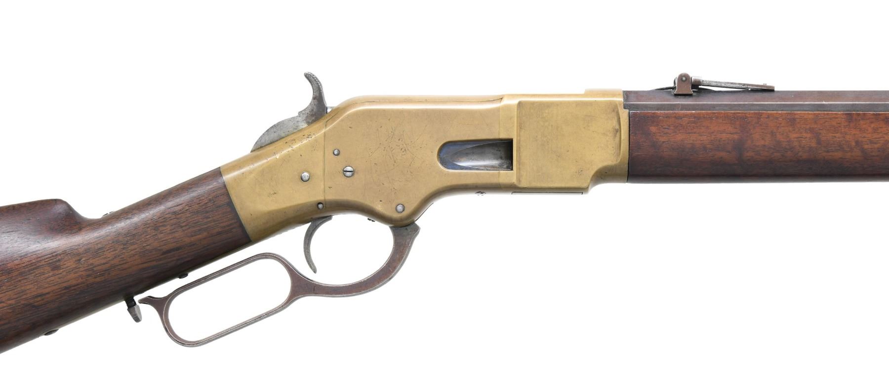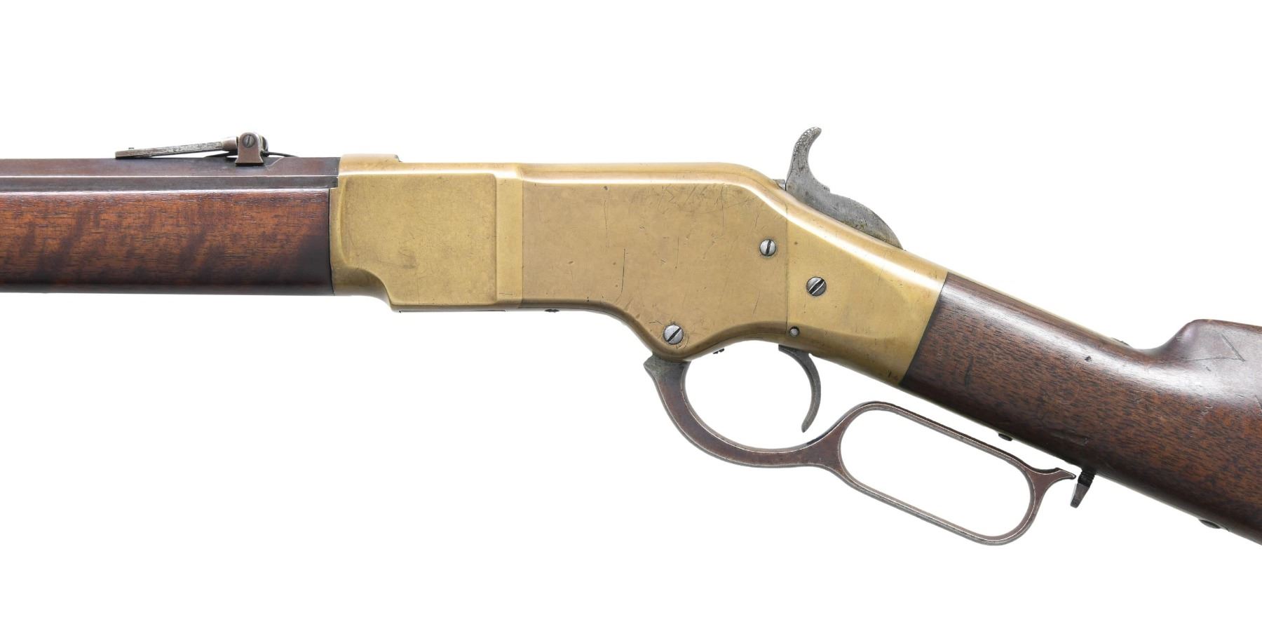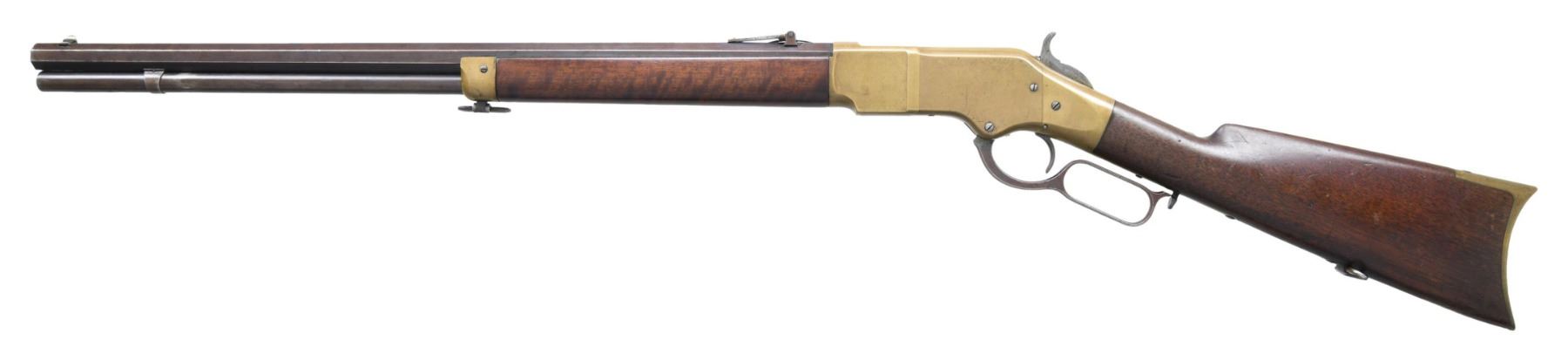 Cal. 44 HRF. S# 121323. Bbl. 24" octagon. Blade front sight w/ graduated leaf rear sight. Full length mag. Walnut forearm & straight grip stock w/ brass trapdoor crescent buttplate. Brass forearm cap & toeline of stock are fitted w/ sling swivels. 1874 manufacture. CONDITION: bbl. & mag. tube blue has largely faded to brown, showing edge & carry wear. Brass receiver shows a pleasing light patina w/ light scratches & handling marks. Forearm has been lightly sanded & refinished. Unsanded stock has worn finish with scattered light to moderate dents, scratches & marks. Bore has slightly darkened appearance with light pitting, with largely intact rifling. (01-27051/DS). ANTIQUE. $7,000-9,000.
